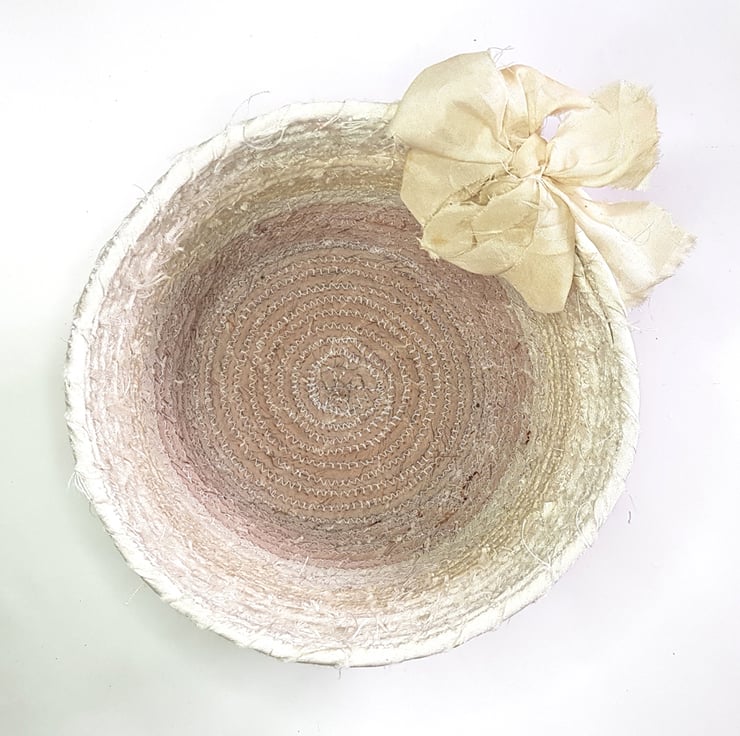 This cream silk coiled basket is ideal for any room as the neutral colour won't clash. Sorry, the lighting has changed the colour somewhat in the pictures but I would be happy to supply more pictures if it would be helpful.