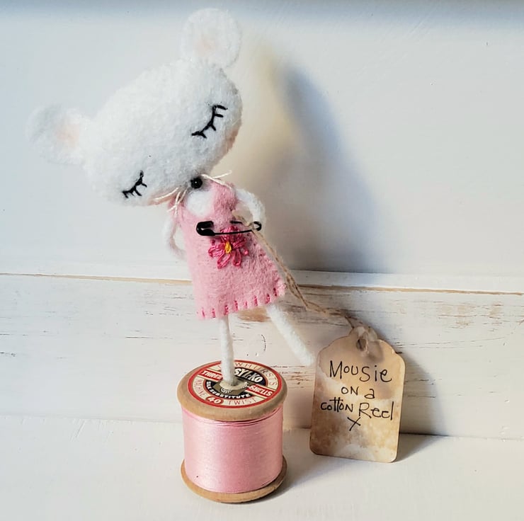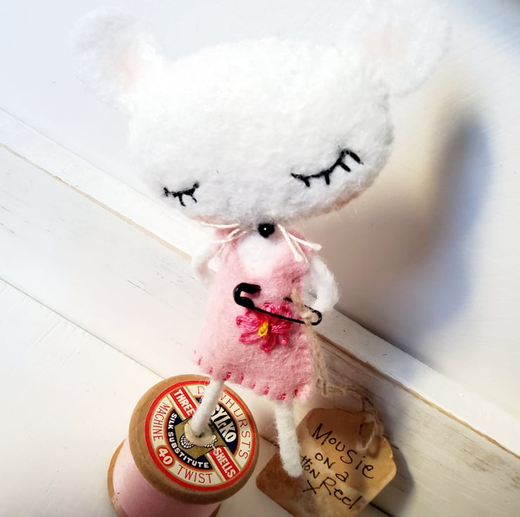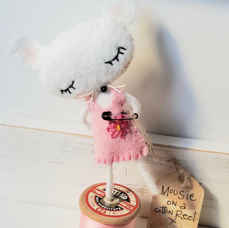 This little mouse is made from wool felt with embroidered eyes ,a glass bead nose and has lightly flushed cheeks. Her arms and legs contain wire. She has been entirely hand stitched and stands at about 14cms including the cotton reel.