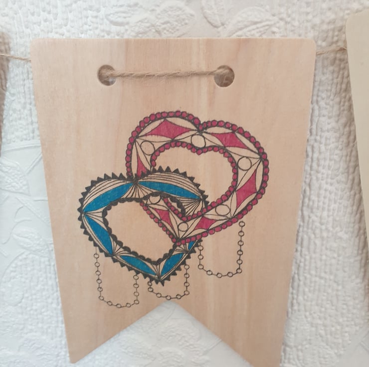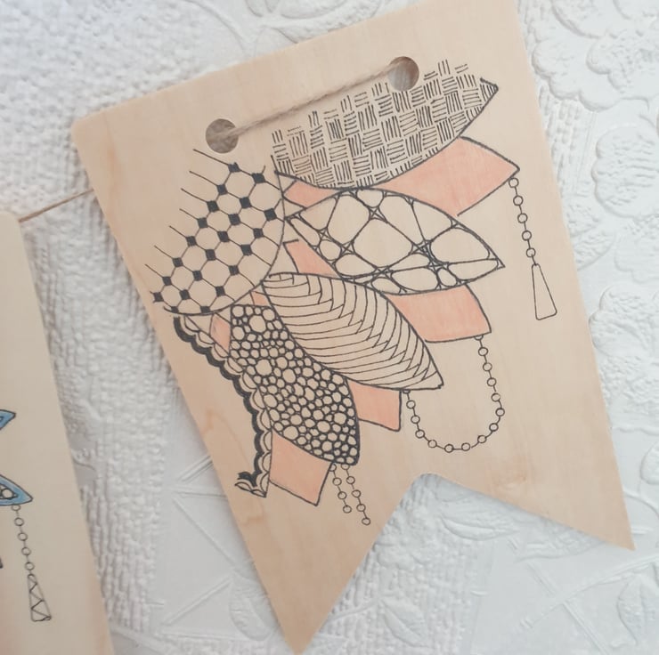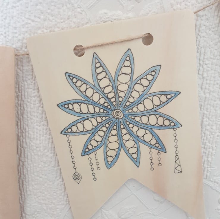 Each image drawn onto the wooden using drawing pen and pencils each bunting piece is 7x10cms in size.