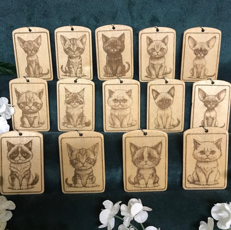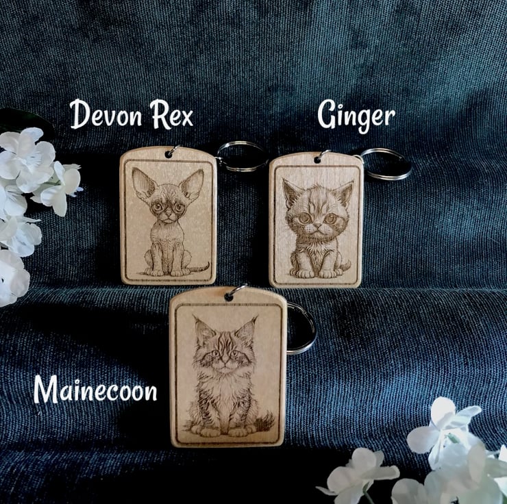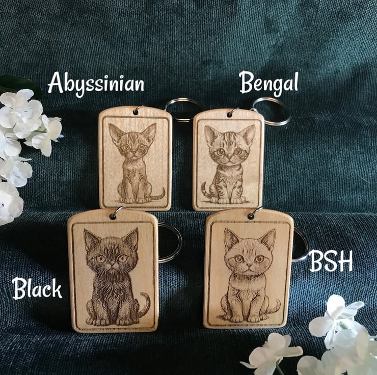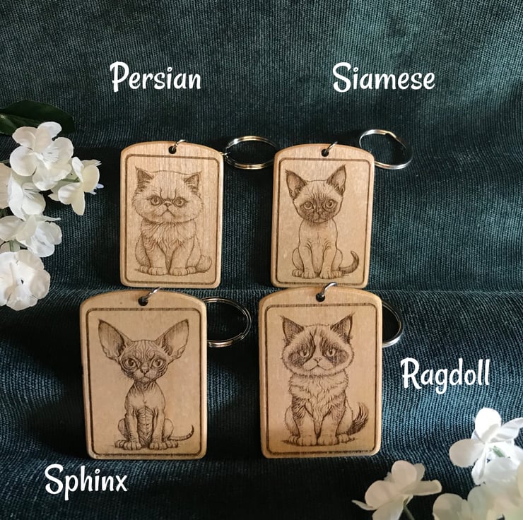 Laser engraved cute cat keyrings with 14 different designs of cat breeds to choose from. Each one is hand finished and on a swivel keychain. Perfect gift for cat lovers, pet lovers gift