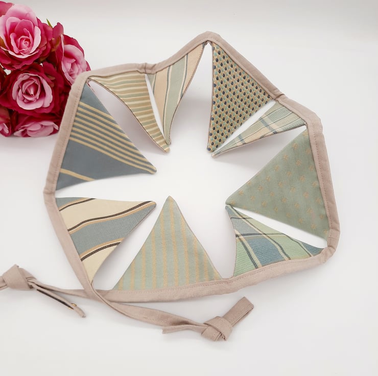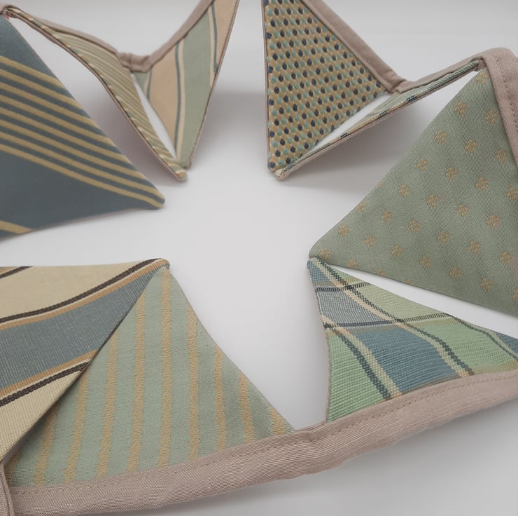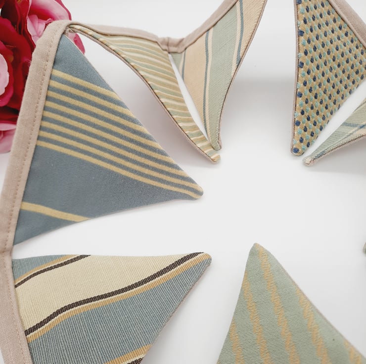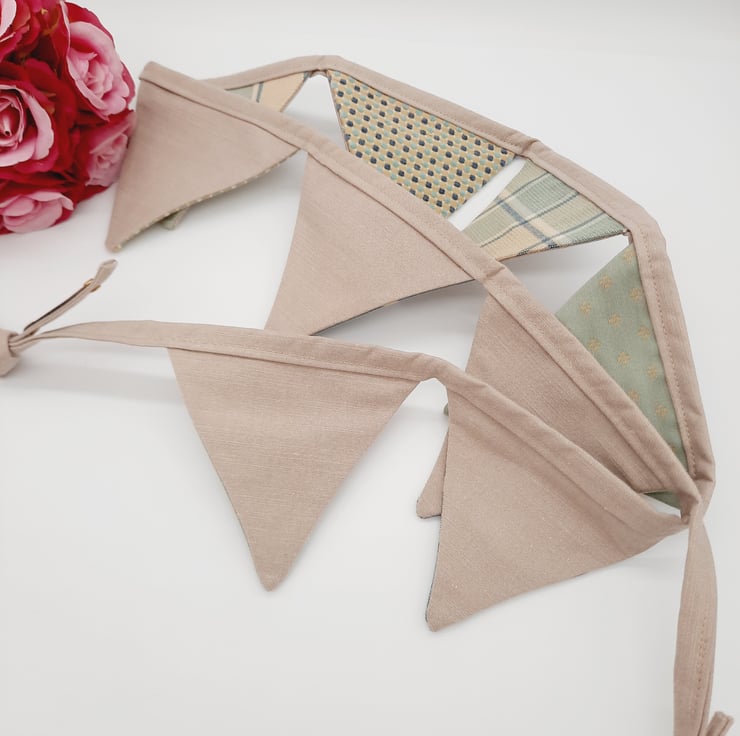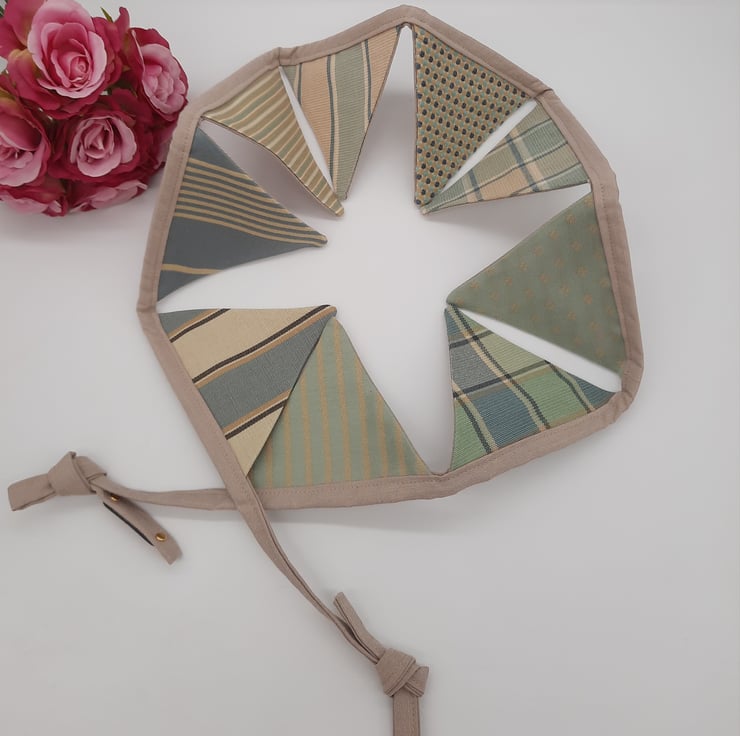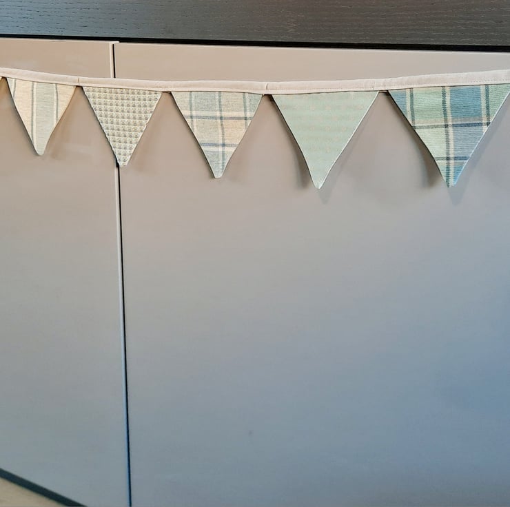 This lovely bunting has 9 complementing fabric triangles. Each has a different pattern, dots, checks, stripes and flowers.