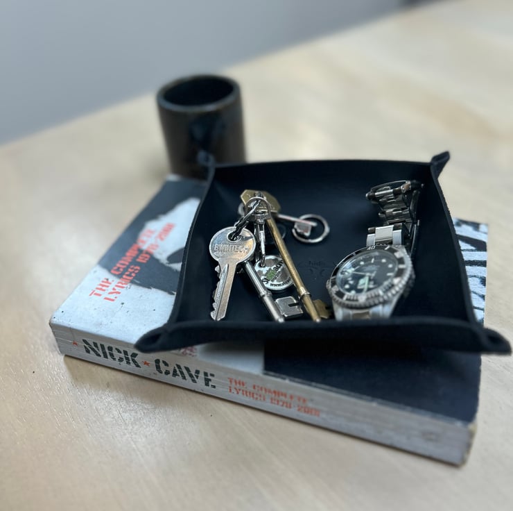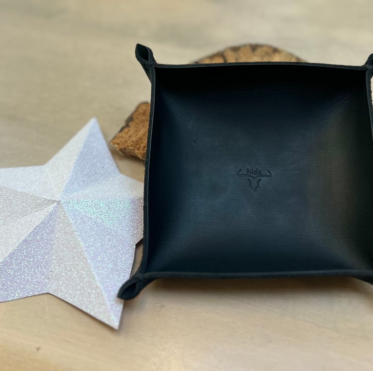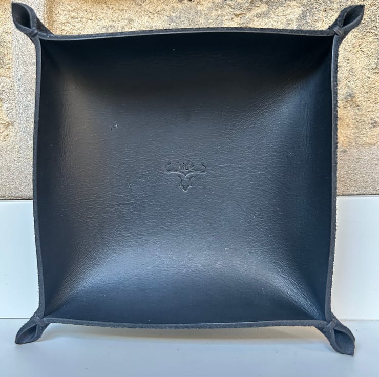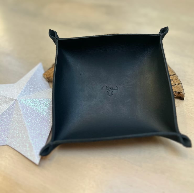 Black leather tidy tray/valet tray. A stylish and practical gift to hold loose change, keys, jewellery, keys, collar stiffners, cufflinks etc.