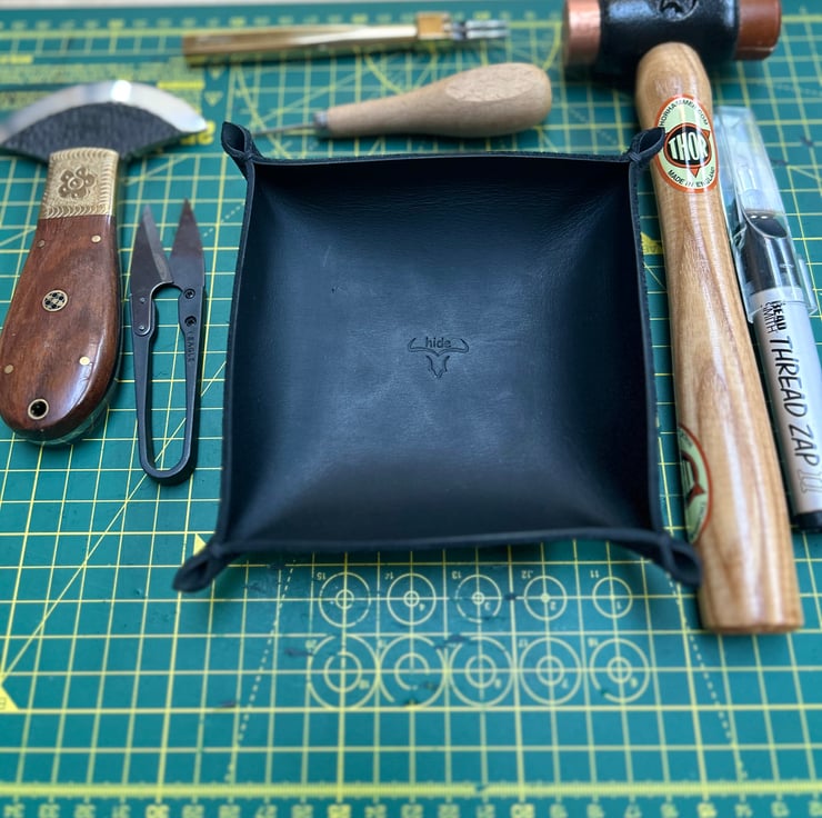 Made from beautiful crazy horse leather in black, hand stitched at the corners with a durable waxed thread in black and featuring my Hide logo.