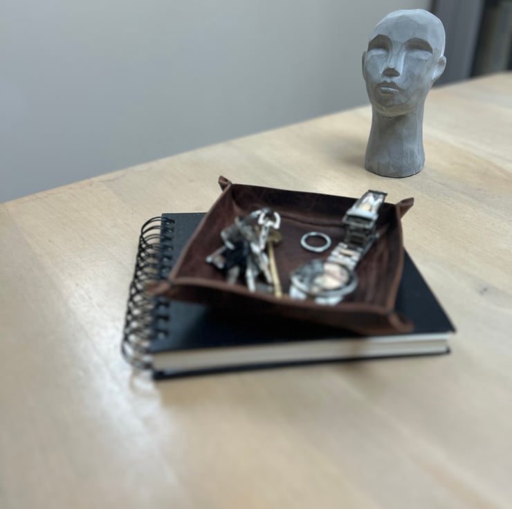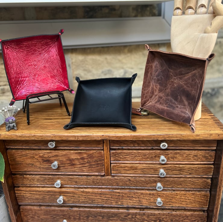 Brown leather tidy tray/valet tray. A practical and stylish tray to hold loose change, keys, jewellery, keys, collar stiffners, cuff links etc. Would make a great gift.