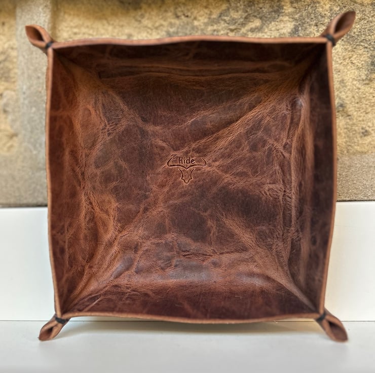Made from two squares of beautiful brown leather hand stitched at the corners with a durable waxed thread in black and featuring my Hide logo.