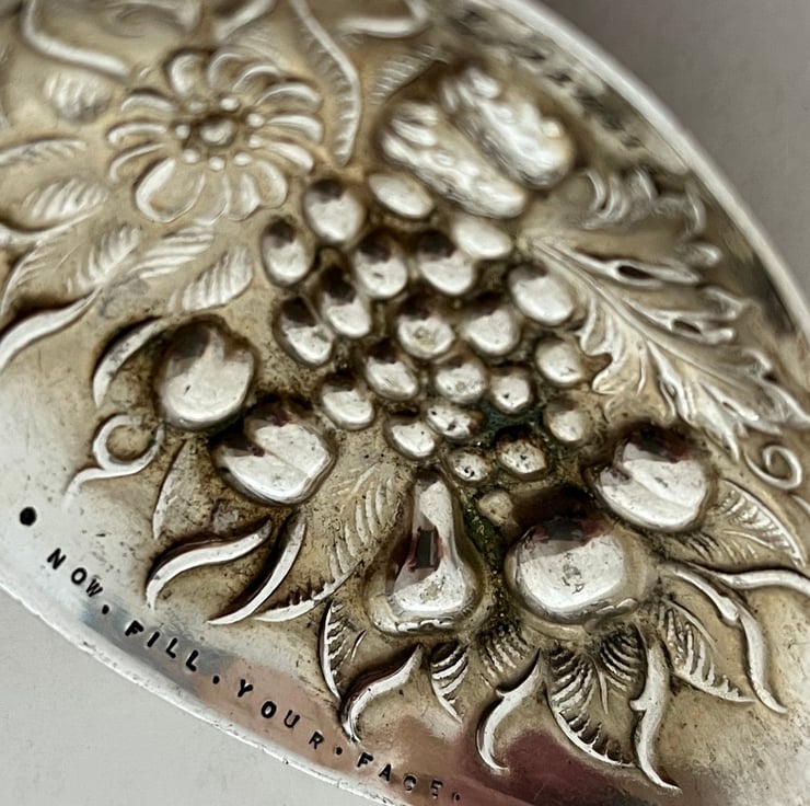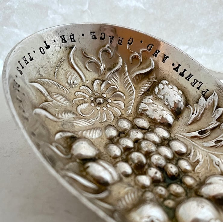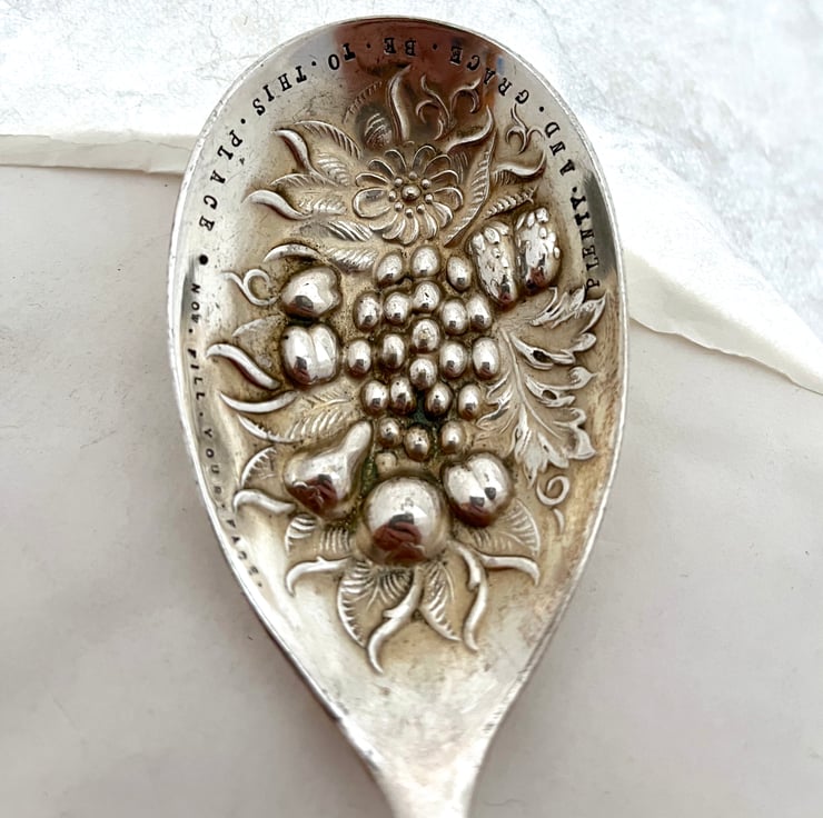 A vintage fruit pattern embossed 'berry' spoon that I've handstamped around the edge: