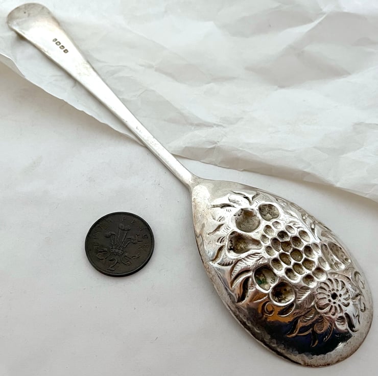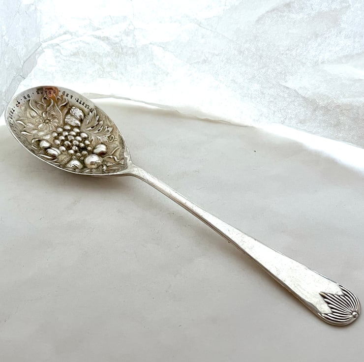 You will receive the spoon shown in the photographs. Please note that it is a vintage or indeed an antique item, I would guess Victorian, so it has quite a lot of wear to the raised parts of the design, there is some residual tarnish and there are scuffs and wear marks. This may not bother you but I think it's worth pointing out at this stage so that you (or whoever you give this to) won't be disappointed. This is a spoon with heaps of vintage character, rather than a mirror-finished brand-new-looking one.