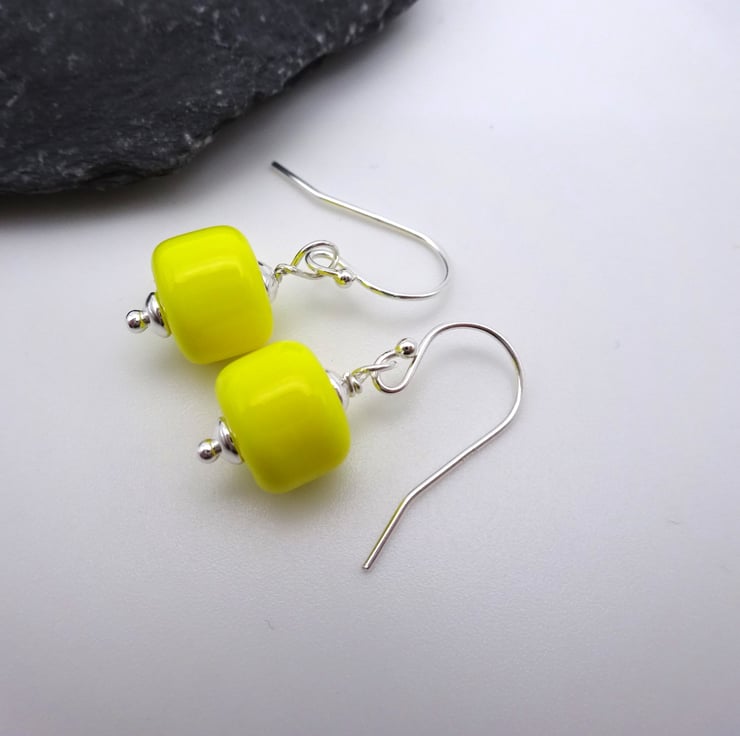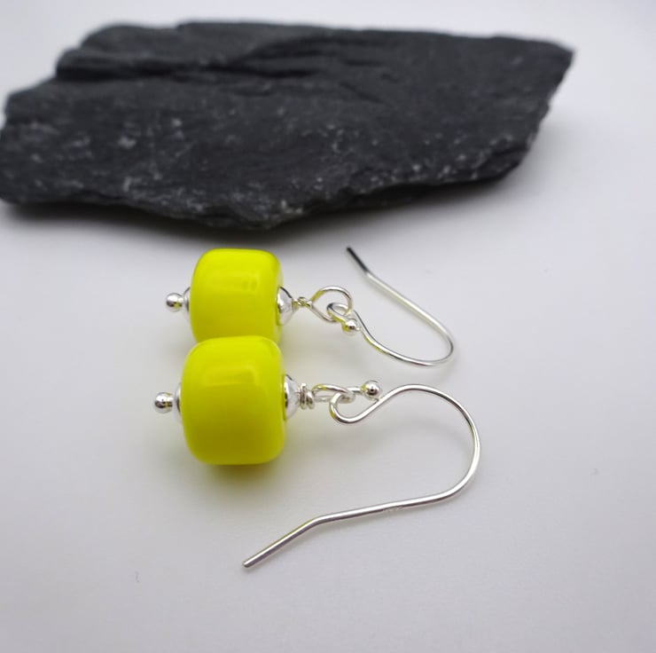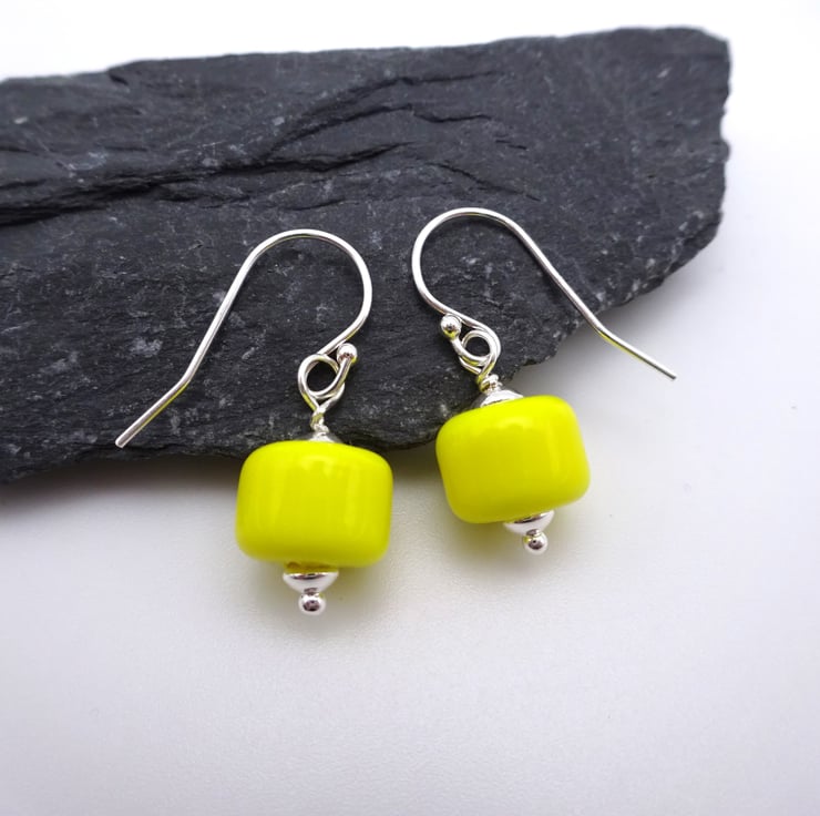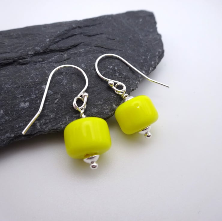 They feature sterling silver ear wires, sterling silver beads and handmade lampwork yellow glass beads.