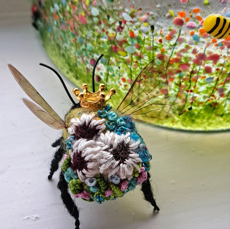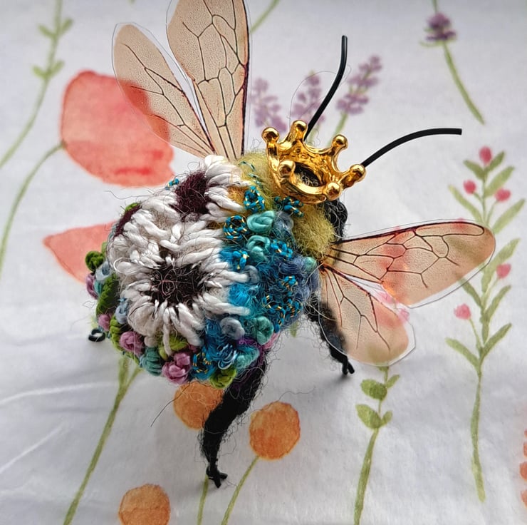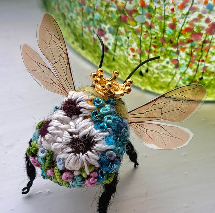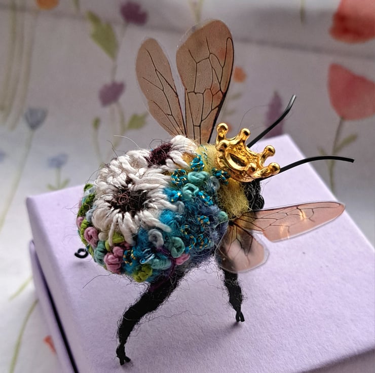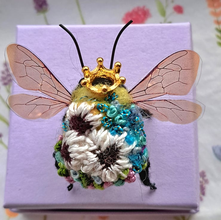 Needle felted and embroidered queen bee,,complete with tiny crown. measures approx 3 cm long by 5cm wide .Your bee will come with a fine gold hanging thread ,which can be snipped off if not required,Gift box included.This is actual bee you will purchase.
