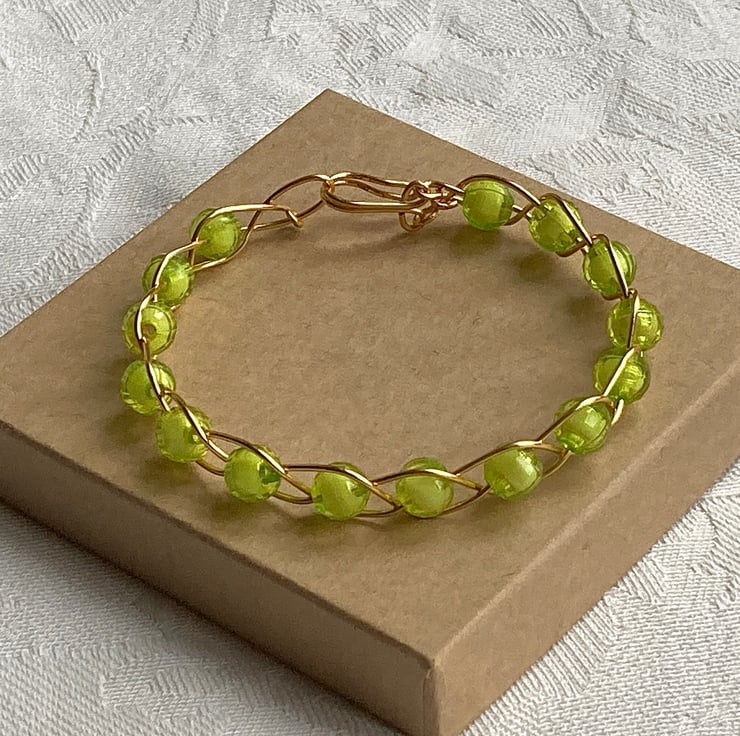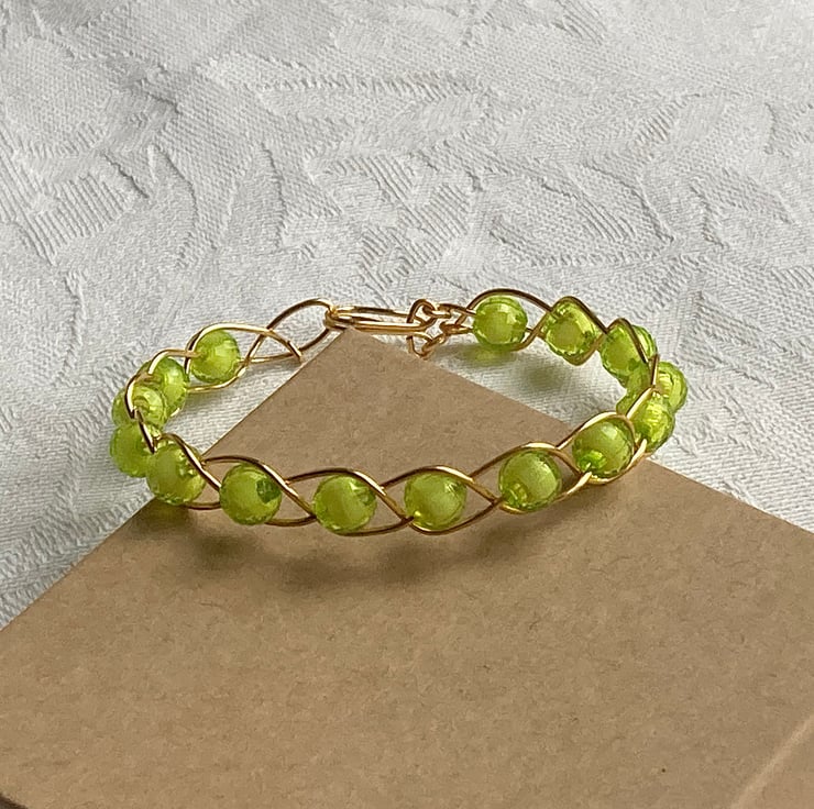This wire bracelet is made with gold coloured silver plated copper wire and lime green acrylic beads. Secured with a handmade hook and eye clasp.
