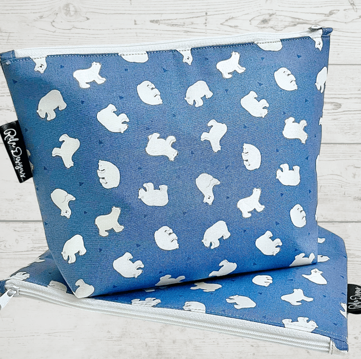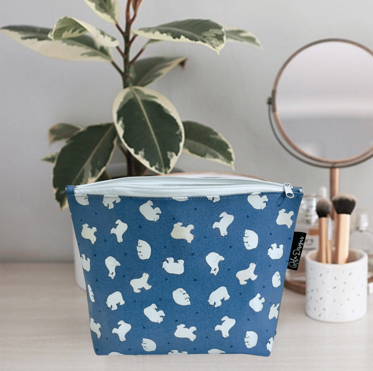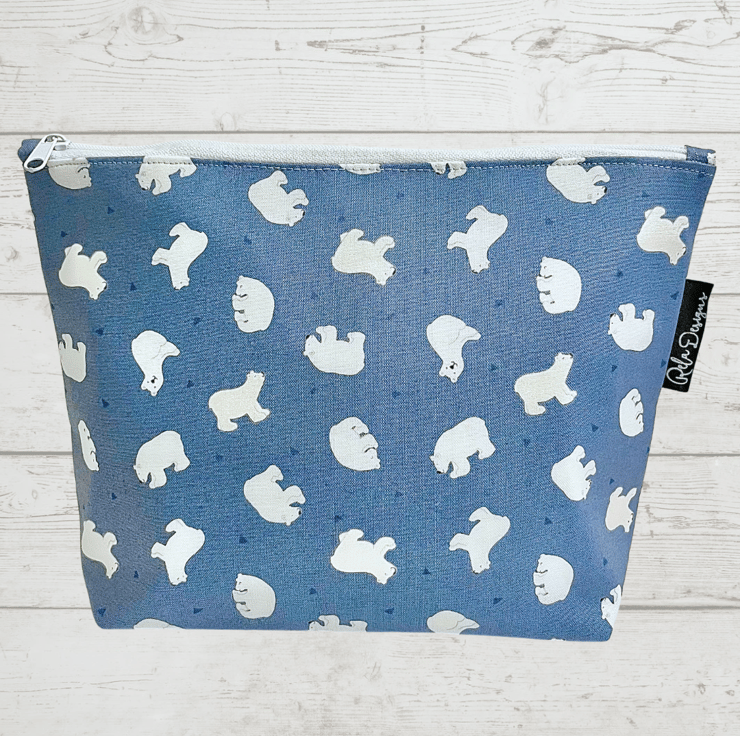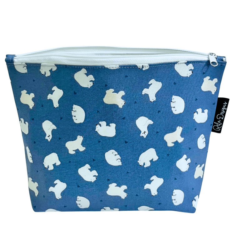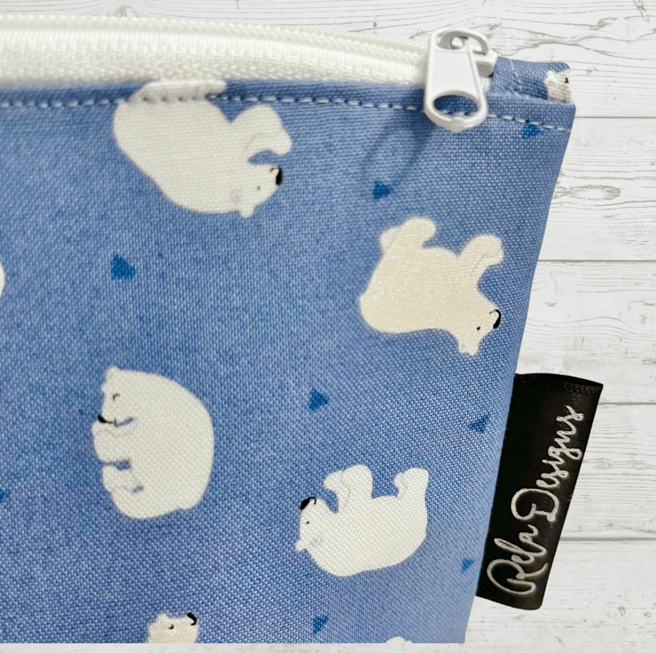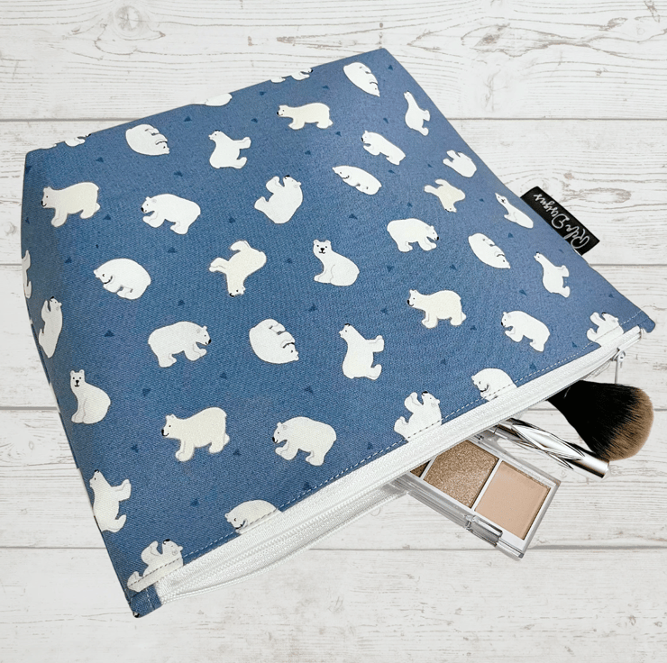 This cute polar bear print cotton zipped pouch has a white waterproof nylon lining , great for those inevitable spills.