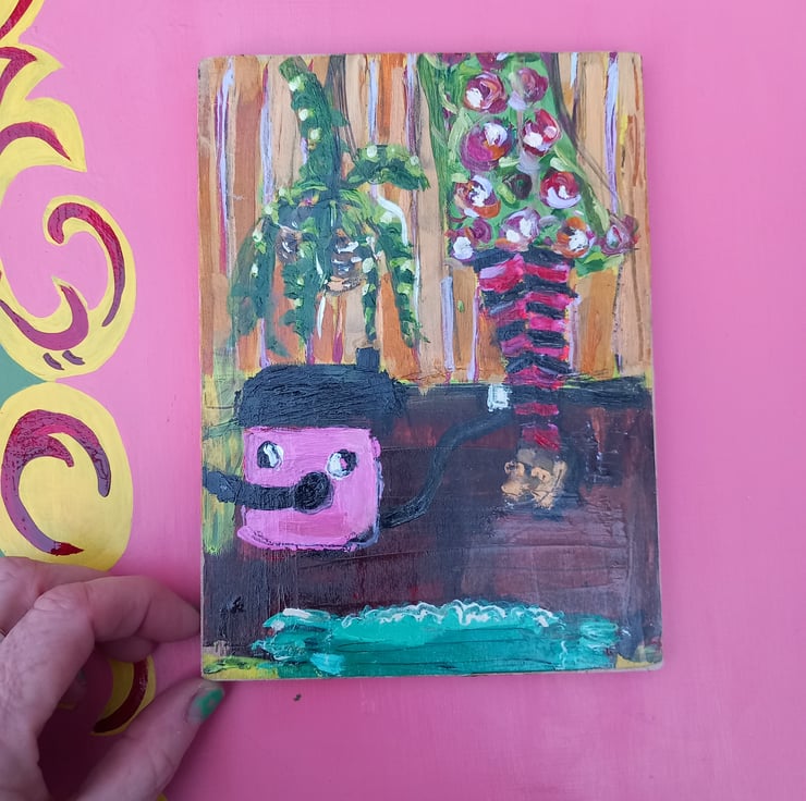 A fun mixed media painting, measuring 24cm.tall. Paint and collage brings it to life. Painted on reclaimed wood which I sand and lightly varnish. Singed and a little hook on the back. Care is taken in its delivery and wrapping.