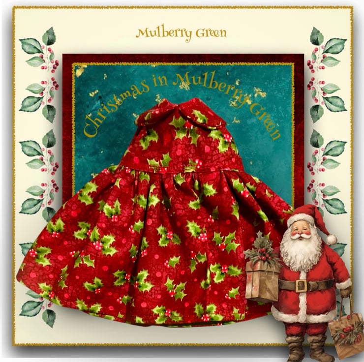 A lovely Holly print Christmas dress, to fit the Mulberry Green dolls. The dress is handmade from best quality cotton, has a lined bodice and fastens at the back with a little popper