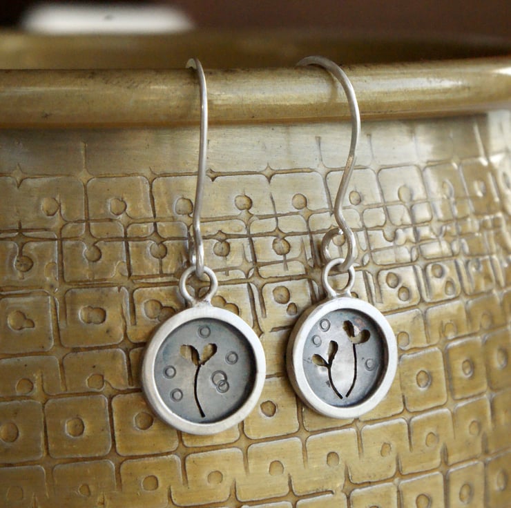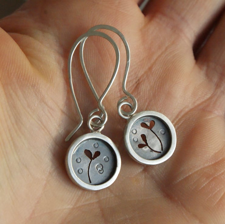 A sweet pair of earrings hand crafted from sterling silver featuring little cut out seedlings. The circles have a sterling silver frame and the background has little circles for texture. The silver is oxidised and polished back to a satin finish. The ear wires are hand made from sterling silver wire.