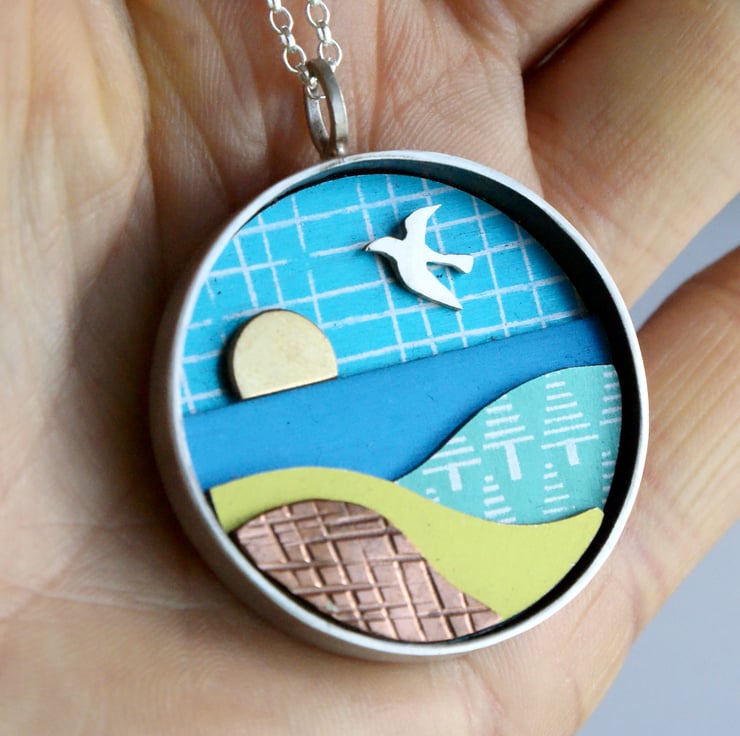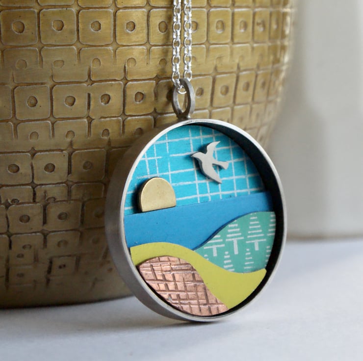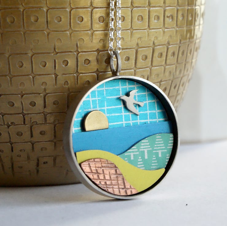A lovely shadow box necklace featuring a sunny seascape. It would make a perfect gift for that special someone. These view has been constructed in layers of coloured aluminium, copper and brass which gives a lovely 3D effect. It is set within a sterling silver frame with deep sides, known as a shadow box and has a bird and sunshine in the sky. The inside edge has also been oxidised to a dark grey which really makes the colours pop. The silver has been polished to a satin finish. This piece is completely hand made, cut, soldered and assembled by me from start to finish.