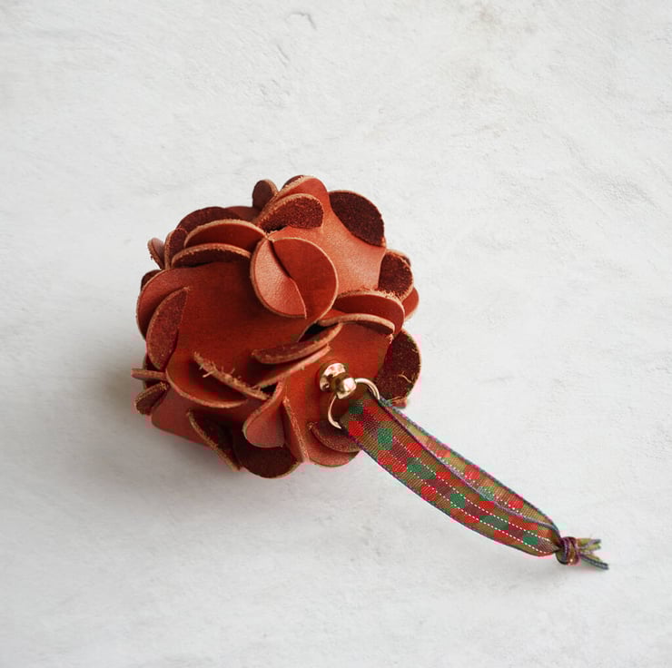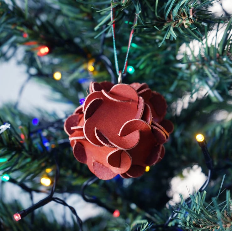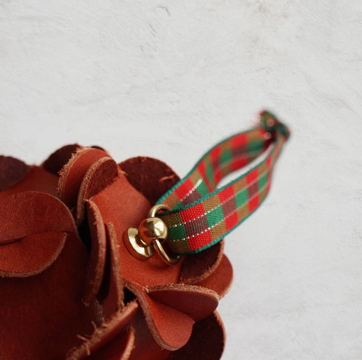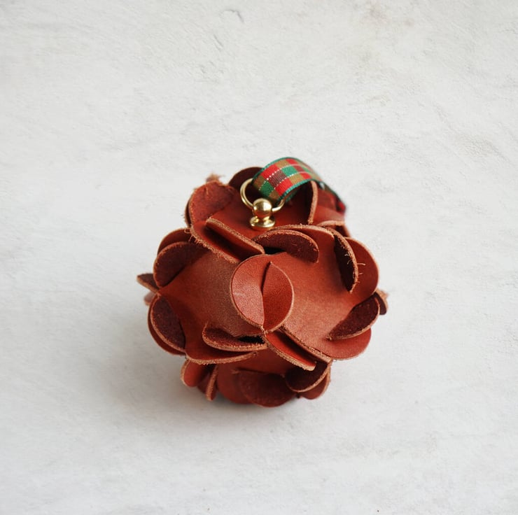 Add a touch of sophistication to your Christmas tree with this handcrafted leather ornament, shaped to resemble a delicate hydrangea bloom. Made from premium leather, the ornament is elegantly suspended by a festive ribbon, finished with a gold stud for a hint of luxury. This unique piece offers a blend of natural beauty and refined craftsmanship, making it the perfect statement decoration for those looking to elevate their holiday decor with something truly special.