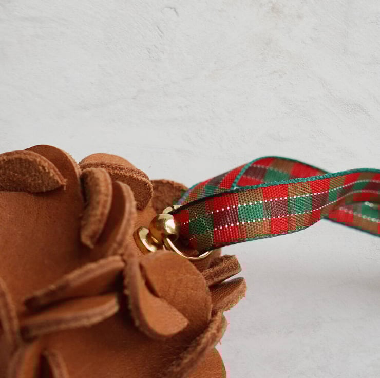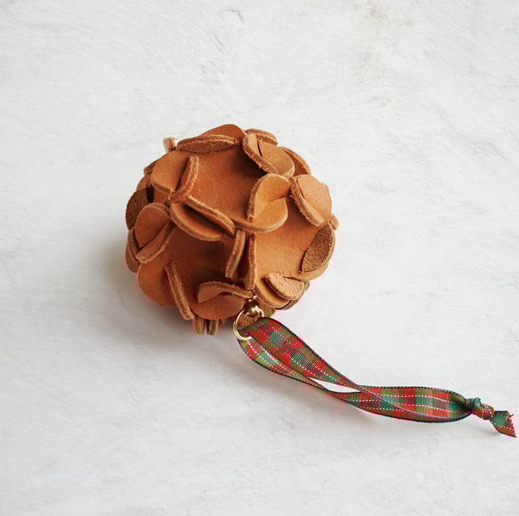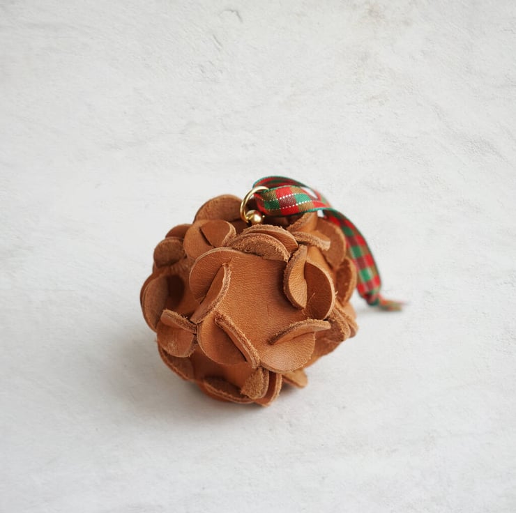 Add a touch of sophistication to your Christmas tree with this handcrafted leather ornament, shaped to resemble a delicate hydrangea bloom. Made from premium leather, the ornament is elegantly suspended by a festive ribbon, finished with a gold stud for a hint of luxury. This unique piece offers a blend of natural beauty and refined craftsmanship, making it the perfect statement decoration for those looking to elevate their holiday decor with something truly special.
