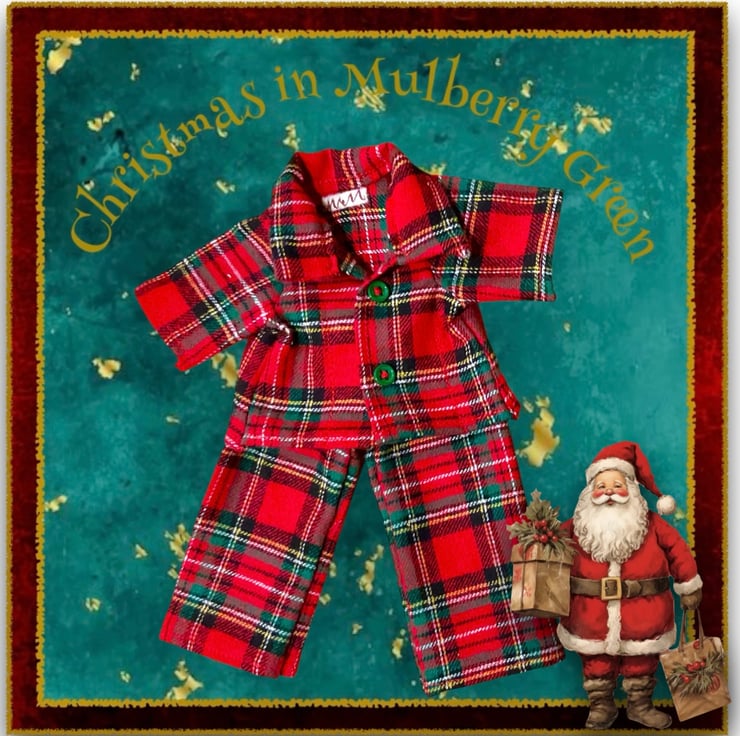 A cute little pair of red tartan Christmas pyjamas, to fit the Mulberry Green characters. The pyjamas are made from soft brushed cotton and are tailored like real pyjamas. They fasten with poppers under two little buttons.