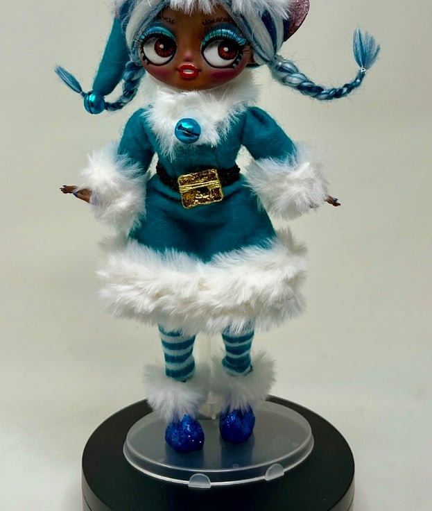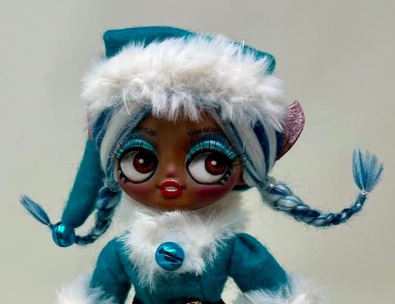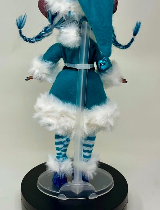 Each Elf for Yourself has her own colour scheme with various points of pose-ability. She has her own handmade dress and hat featuring the classic little bell and faux fur trim. She has handmade glittery shoes with a faux fur white trim, and cosy handmade leg warmers to complete her look.