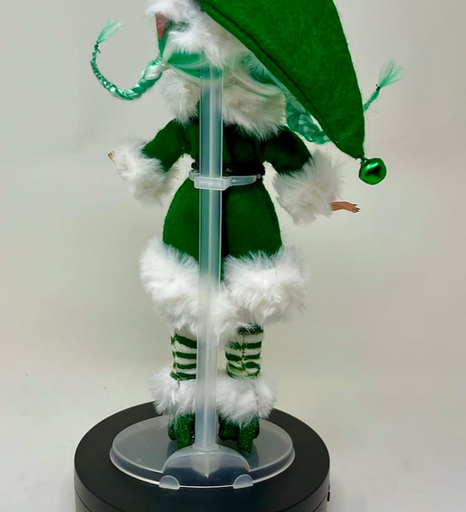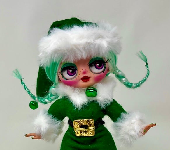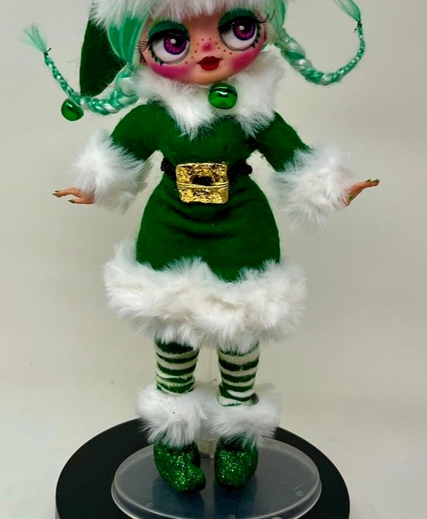 Each Elf for Yourself has her own colour scheme with various points of pose-ability. She has her own handmade dress and hat featuring the classic little bell and faux fur trim. She has handmade glittery shoes with a faux fur white trim, and cosy handmade leg warmers to complete her look.