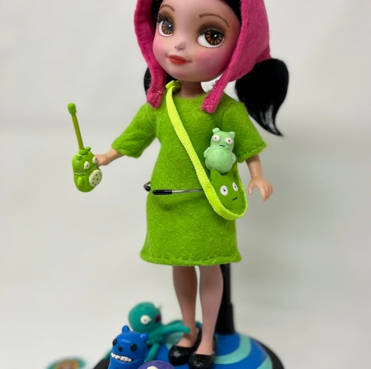 Doll stand included with custom base handmade using clay and acrylic paints.