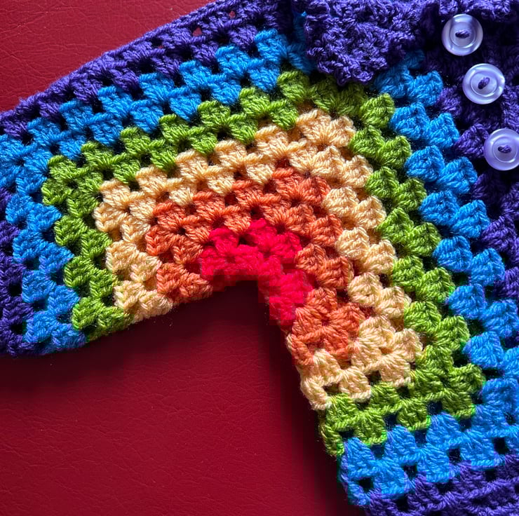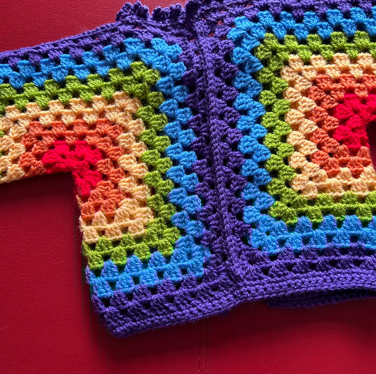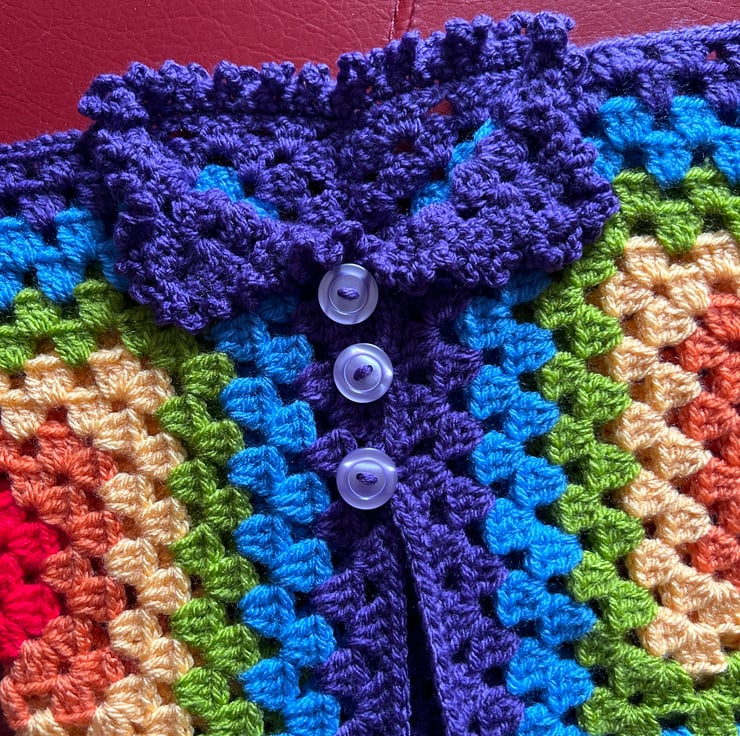 Crocheted cardigan, which has been crocheted in a hexagon using rainbow yarns. The size of the cardigan will fit a 12 month old baby. Finished at the front with 3 buttons.
