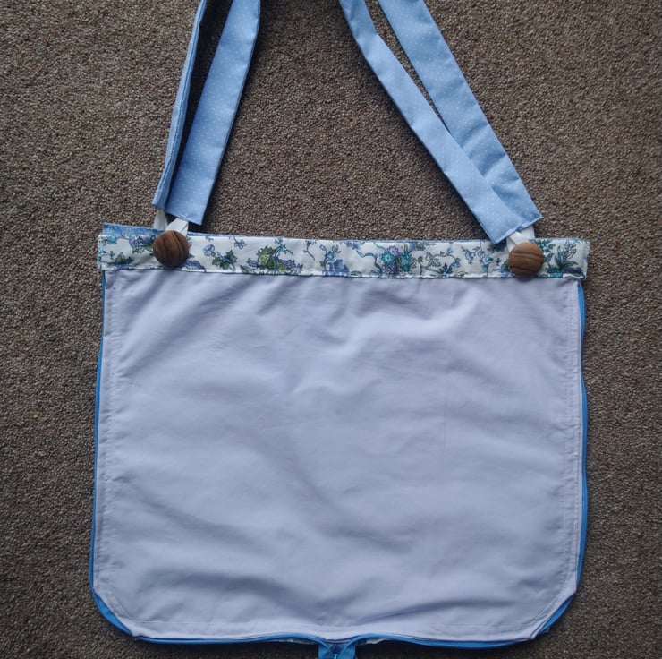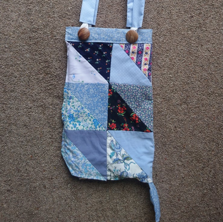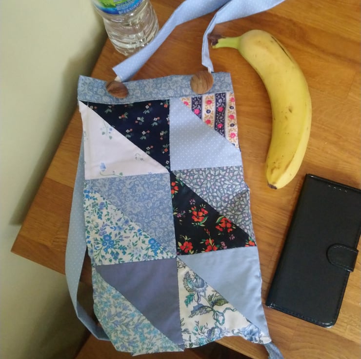 Unique and probably slightly quirky, this patchwork bag is versatile and can be two different sizes! It can be a small bag, maybe just for your phone, purse or maybe just a water bottle. Or it can unzip, move the handles using the buttons and loops and it is a much bigger bag that would take your jumper or some light shopping for example.