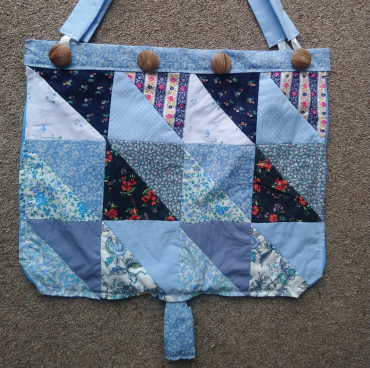 The patchwork is hand sewn in a medley of blue cotton fabrics, and the lining (which becomes the reverse of the bag when unzipped) is in a plain pale mauve cotton.