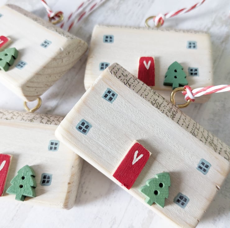 Hand painted with teeny windows and wooden front doors these one of a kind houses are ready to hang.