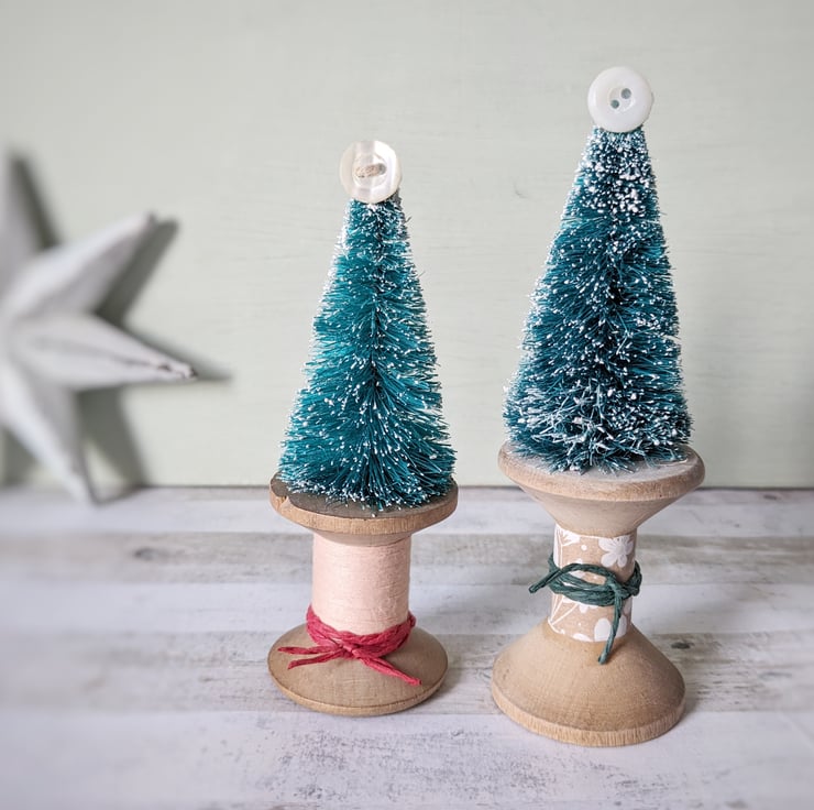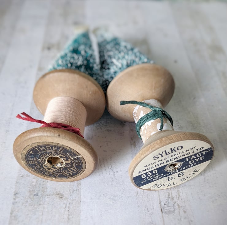 A little Festive tree sits atop a worn vintage wooden bobbin with a teeny mother of pearl button for a star!