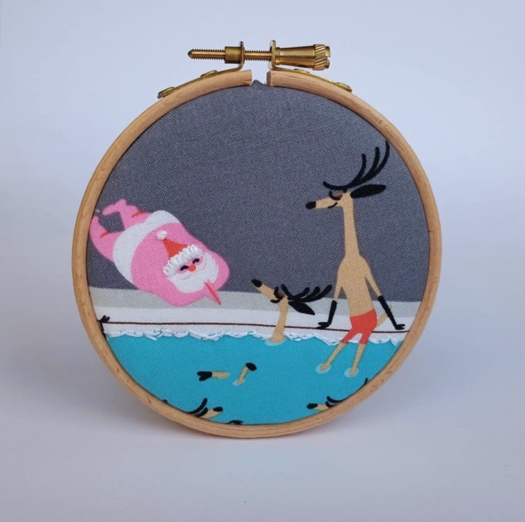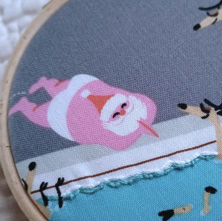 After carefully cutting a circle to feature Santa in all his pink-ness, I add a layer of soft wadding before hand embroidering some waves at the pool's edge. I then securely fit the fabric into a Elbese wooden embroidery hoop and hand gather the edges at the back and finish with a circle of pure wool felt neatly blanket stitched all the way round the ring.
