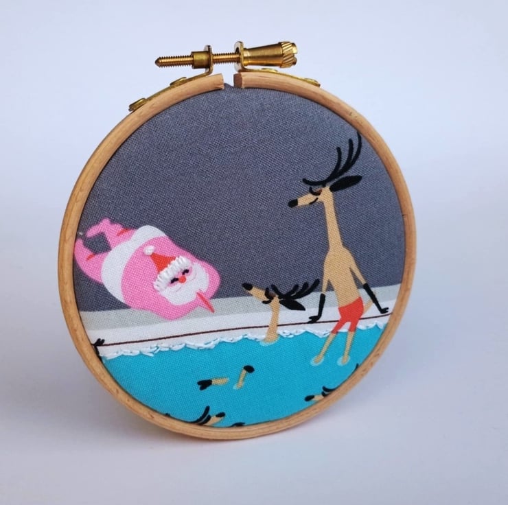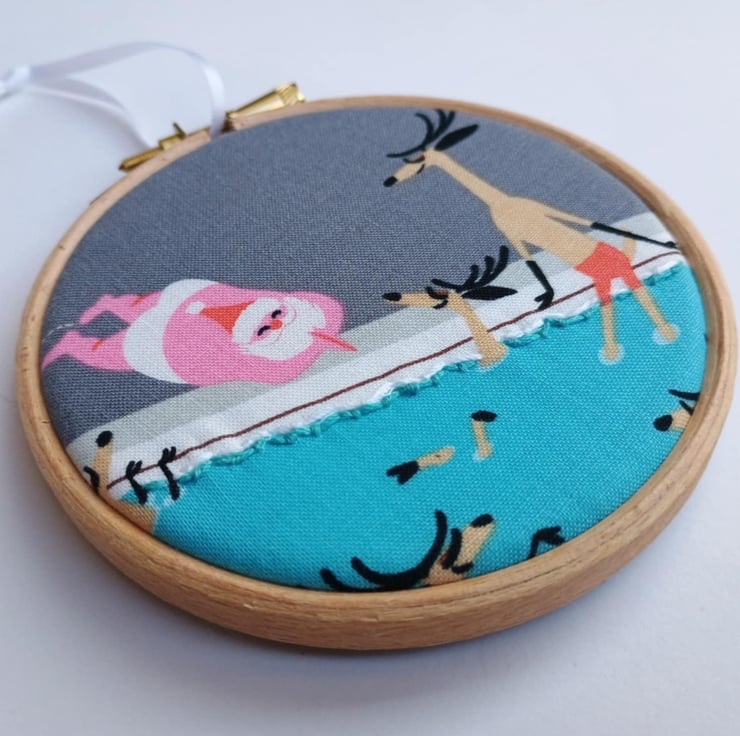 Santa diving into a swimming pool filled with chilled out reindeer - the fabric I used in this hand embellished hoop art picture never fails to make me smile. I think it would make a perfect Secret Santa gift or stocking filler for anyone with a sense of humour, but especially those often hard to buy for men in your life.