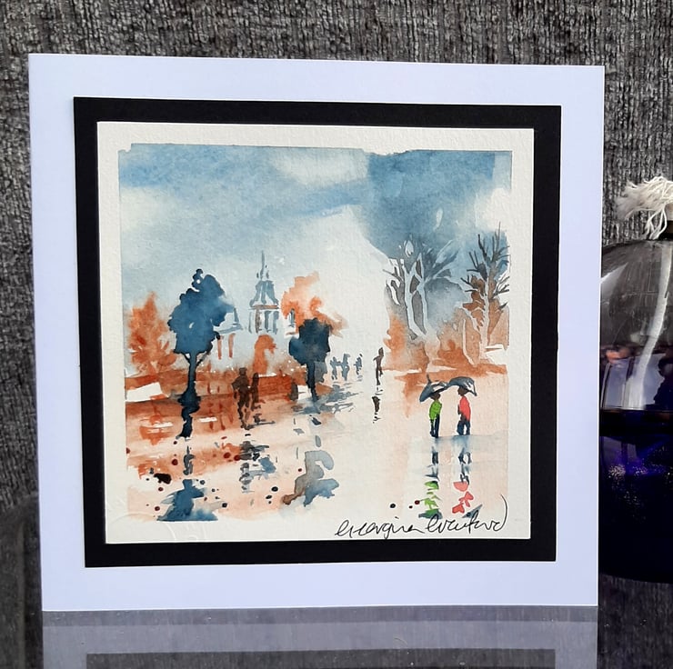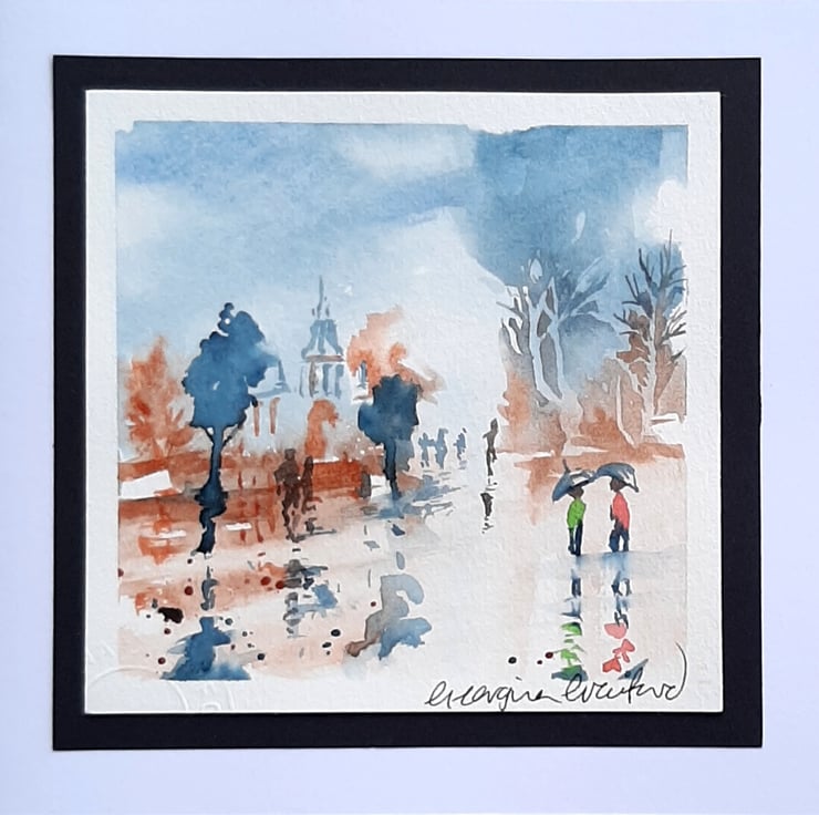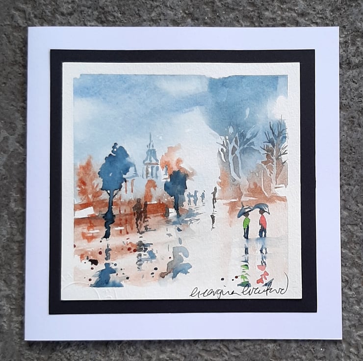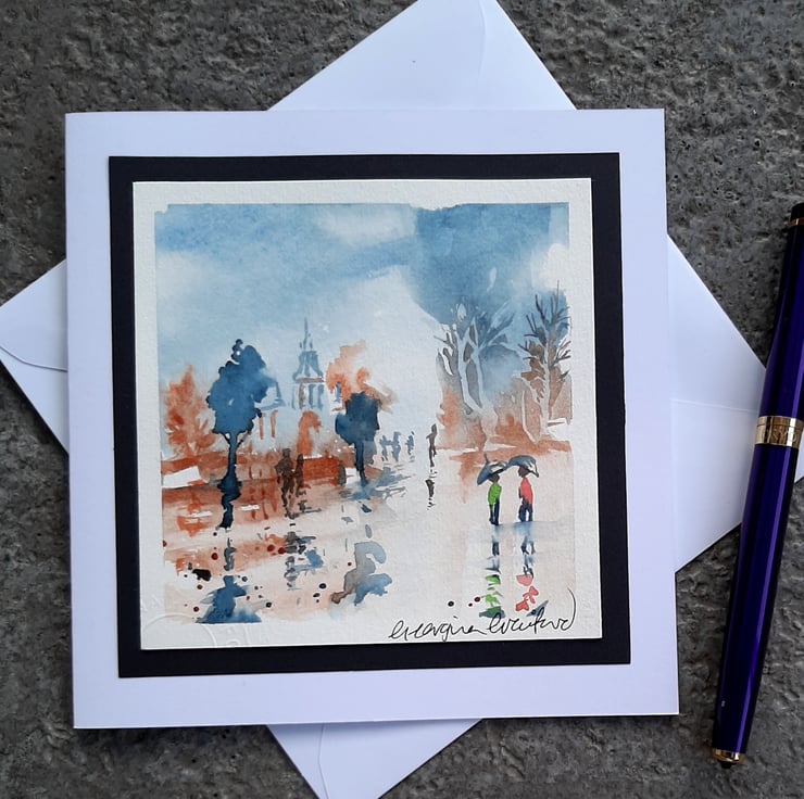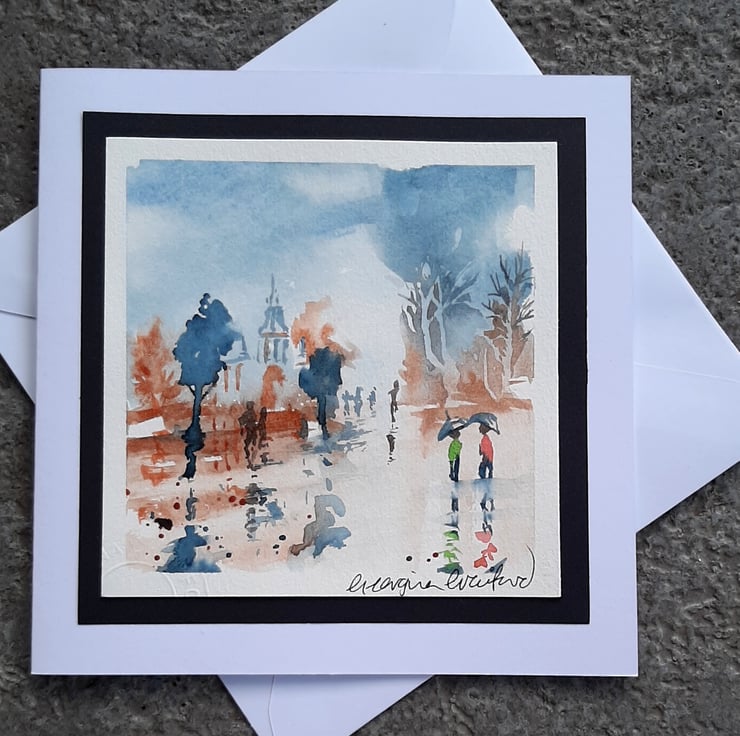 Beautiful handpainted watercolour card of a rainy day walk by.