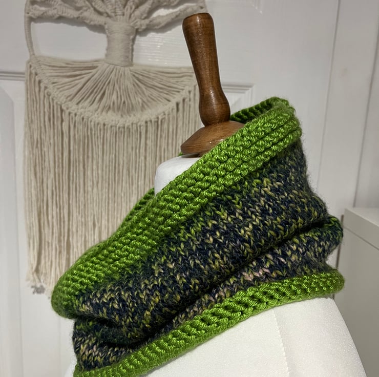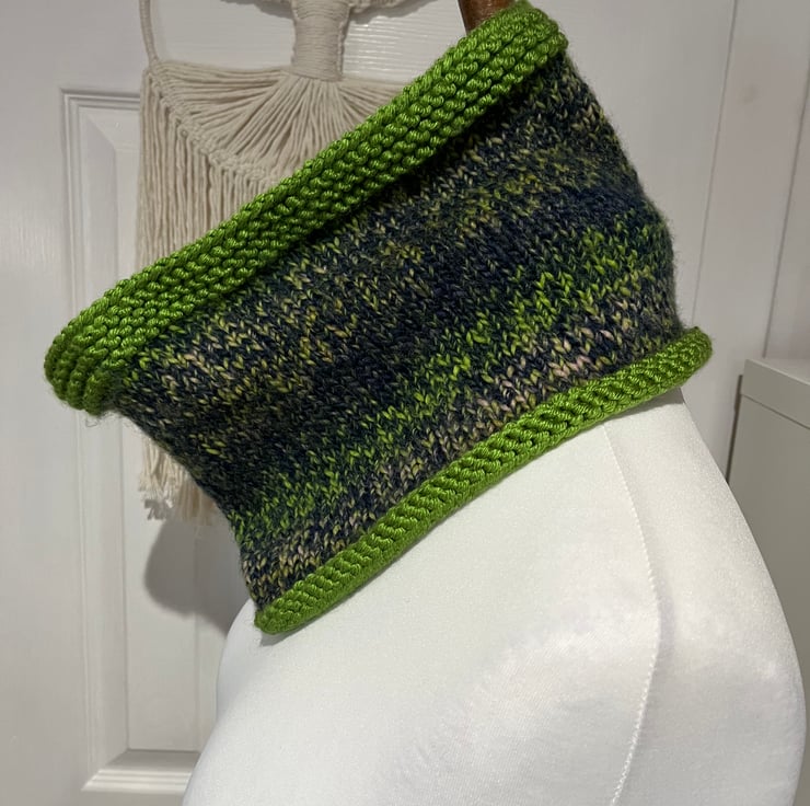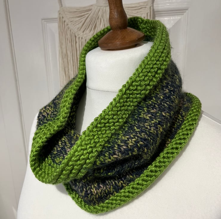 Edged with anti piling lime green chunky wool this is a lovely colour tweed blue and soft pink. The colour of a stormy sea!