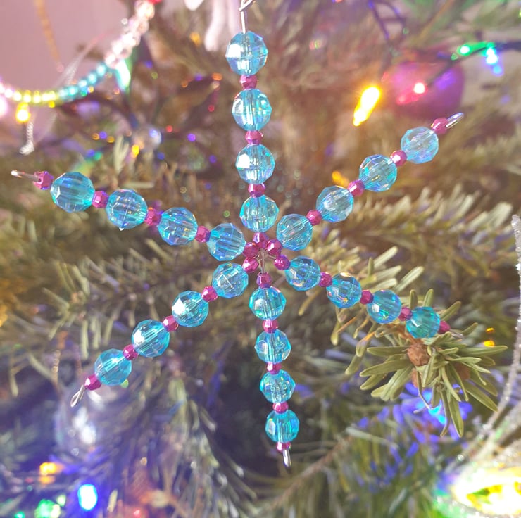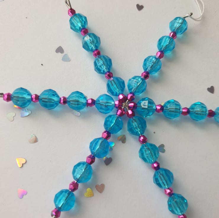 This snowflake is created using blue and pink beads with different shades, shape and sized different beads for colour.