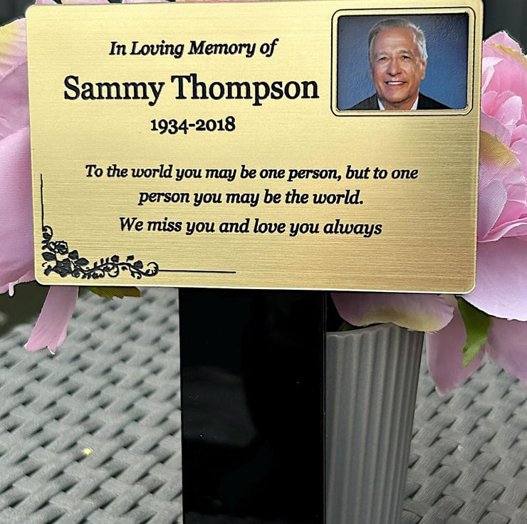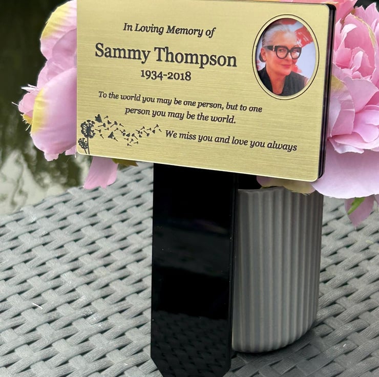 Handmade personalised memorial grave marker stakeplaque created from durable black gloss acrylic and finished with metallic Gold brushed steel effect engraved acrylic.