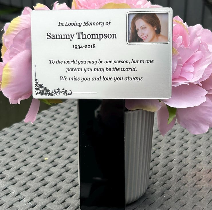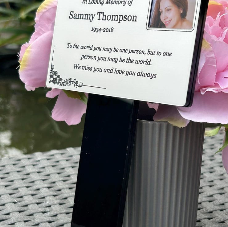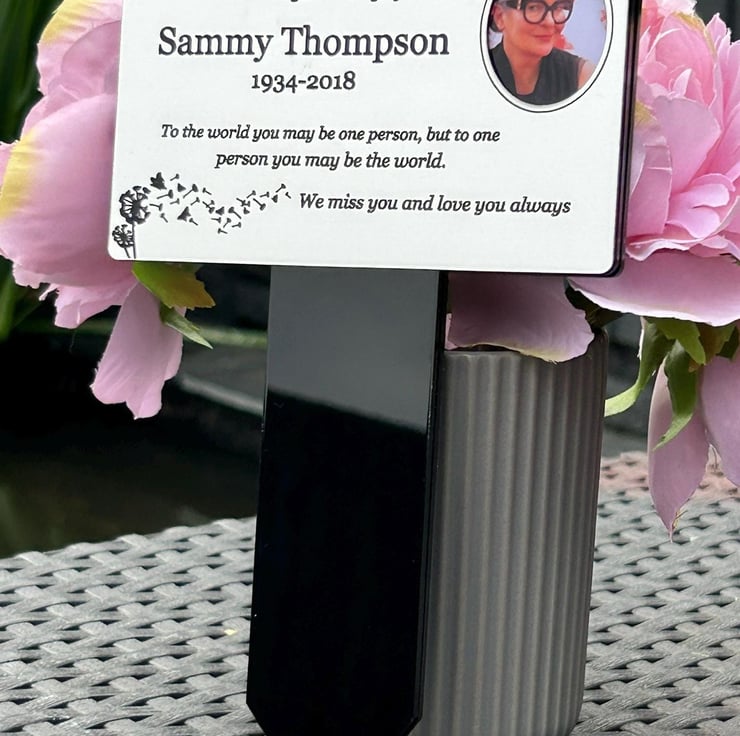 Handmade personalised memorial grave marker stakeplaque created from durable black gloss acrylic and finished with metallic Silver brushed steel effect engraved acrylic.