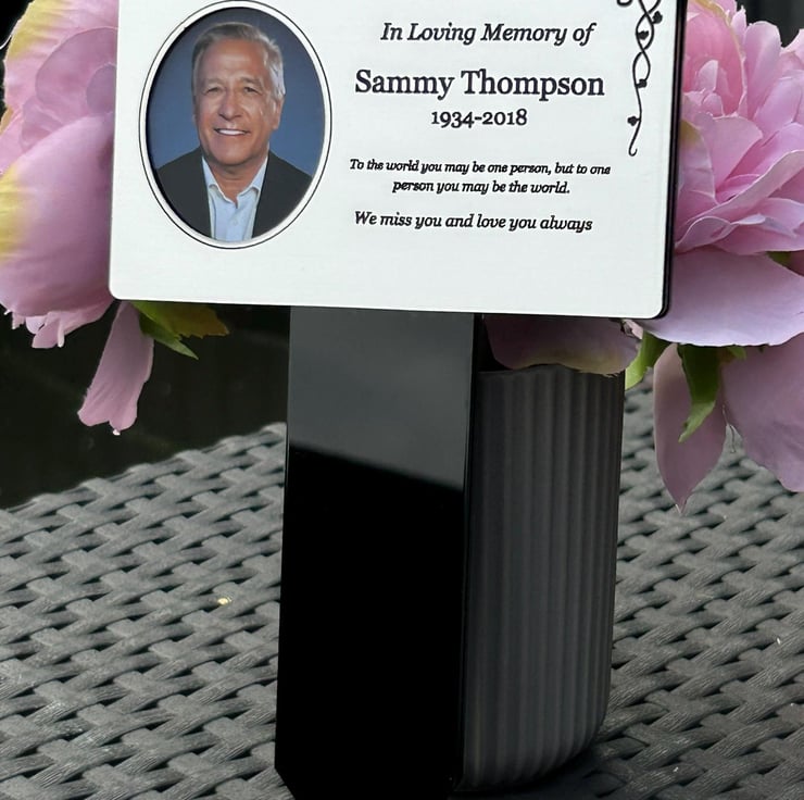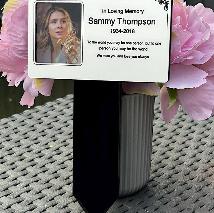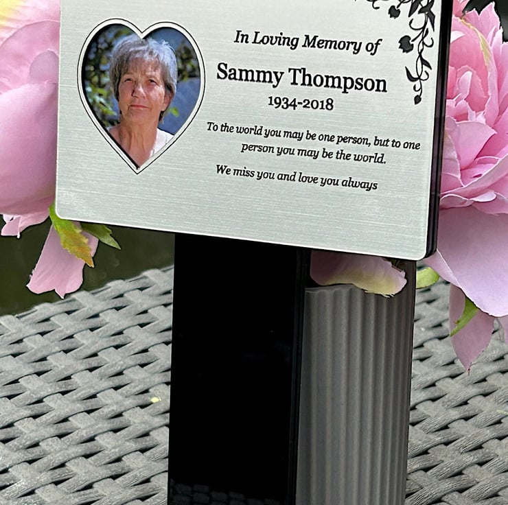 Handmade personalised memorial grave marker stakeplaque created from durable black gloss acrylic and finished with metallic Silver brushed steel effect engraved acrylic.