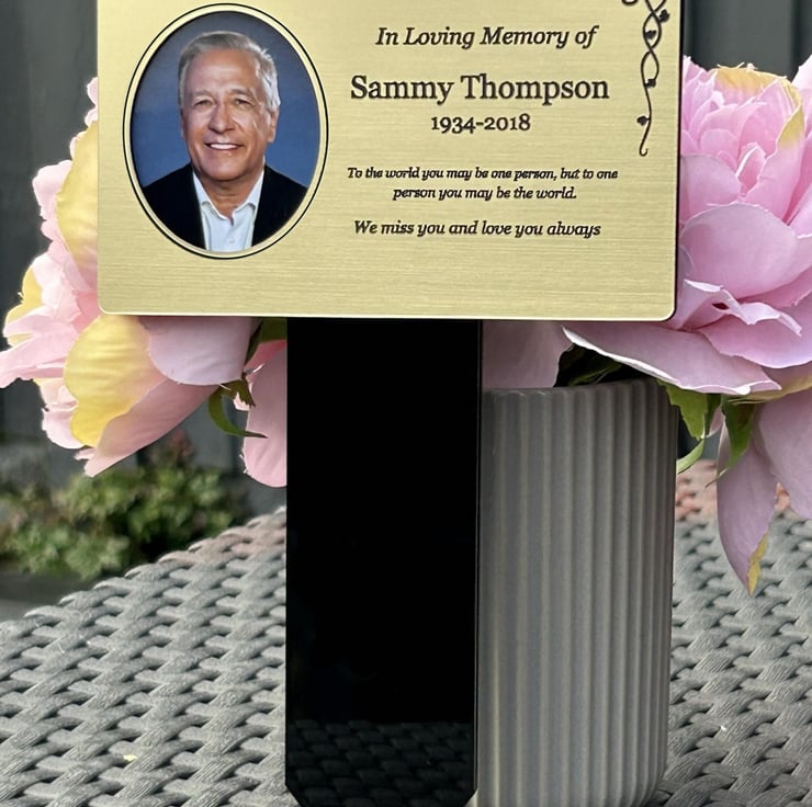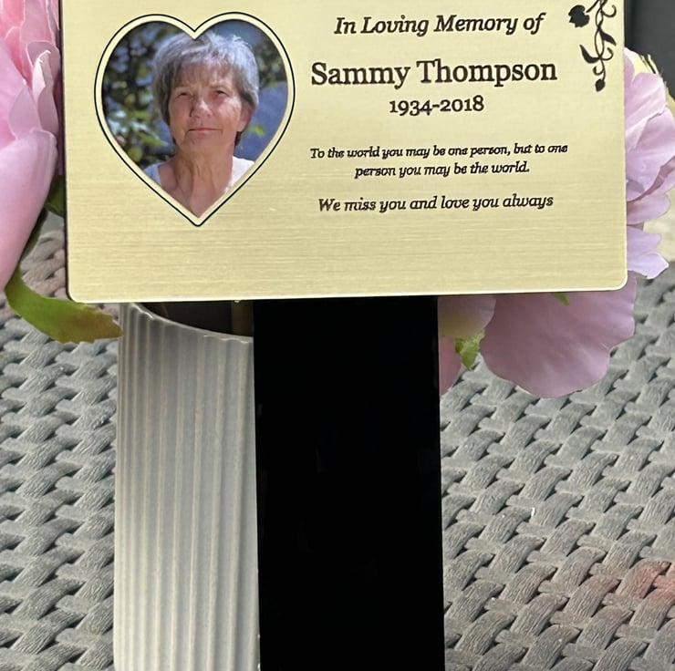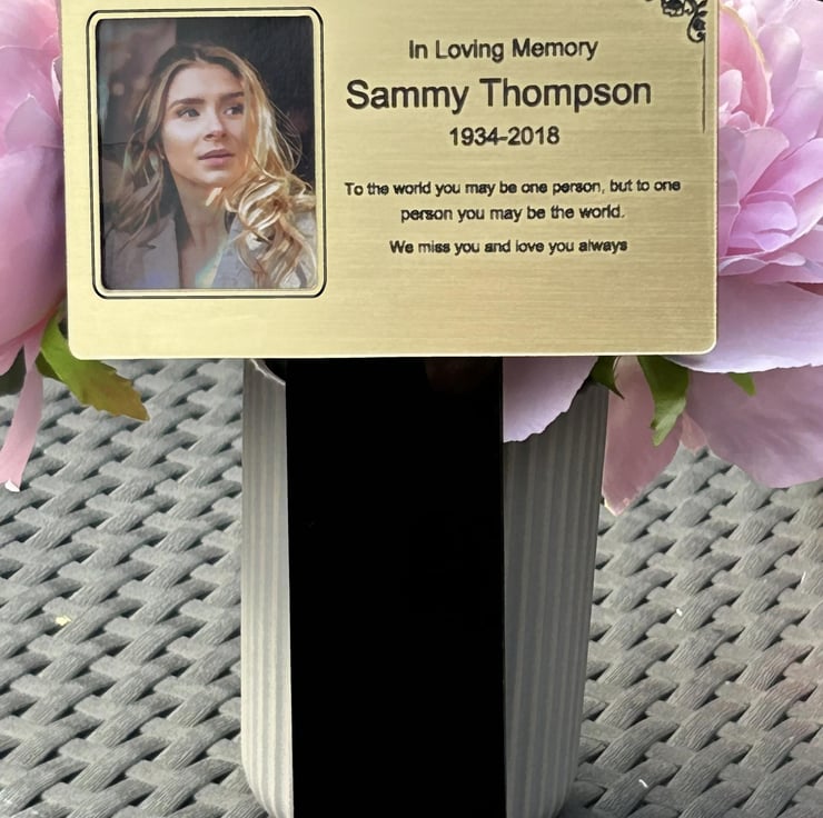 Handmade personalised memorial grave marker stakeplaque created from durable black gloss acrylic and finished with metallic Gold brushed steel effect engraved acrylic.