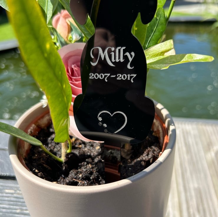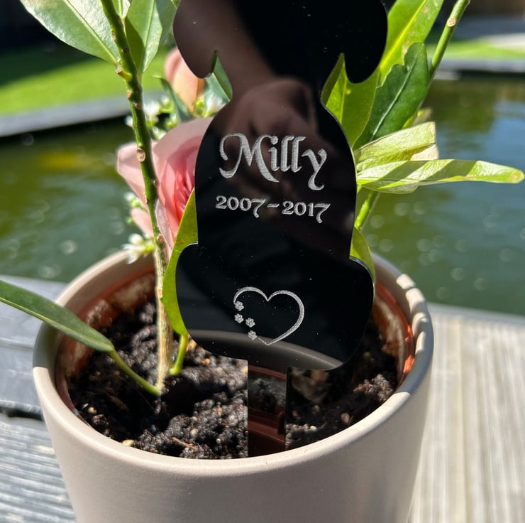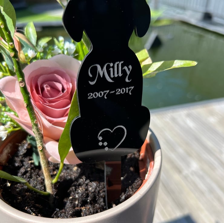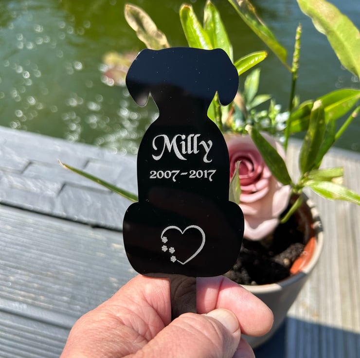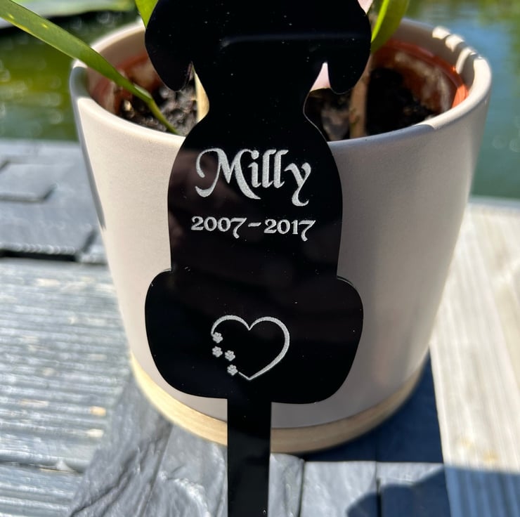 Handmade personalised Pet dog memorial grave marker stakeplaque created from durable black gloss acrylic.