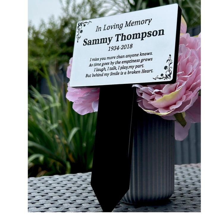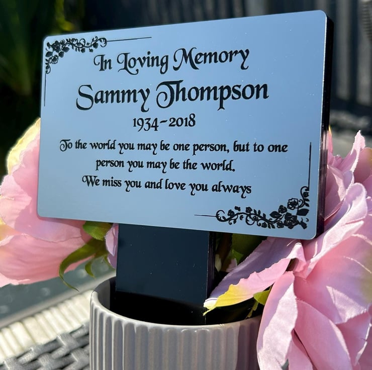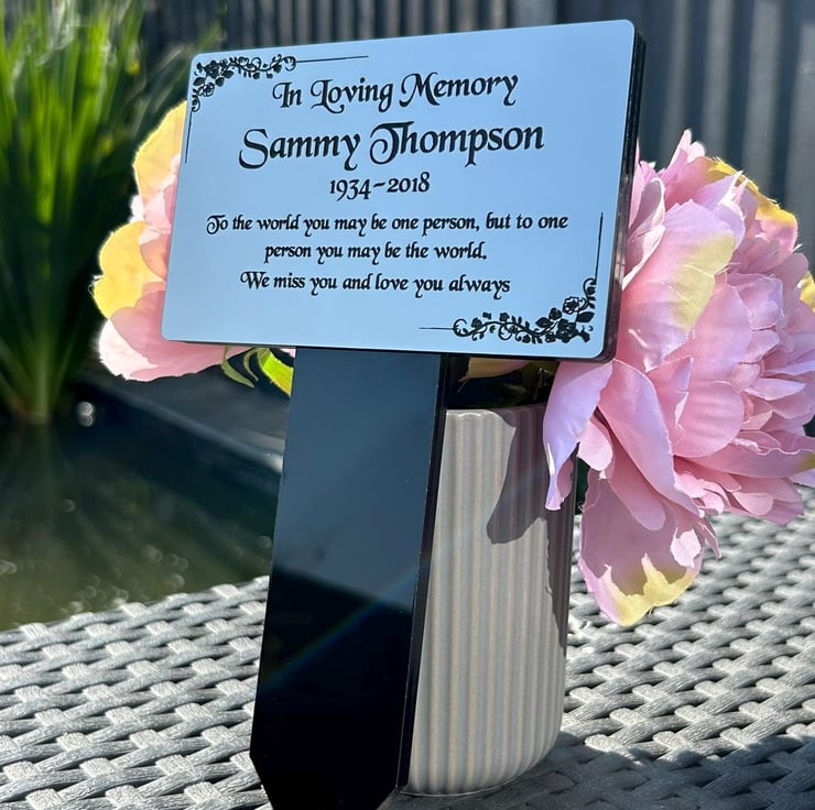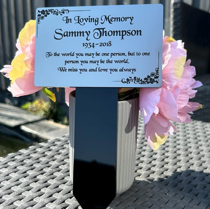 Handmade personalised memorial grave marker stakeplaque created from durable black gloss acrylic and finished with metallic Gold or Silver brushed steel effect engraved acrylic.