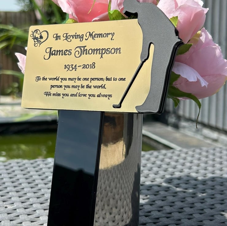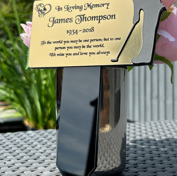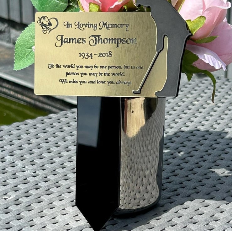 Handmade personalised memorial Golfing grave marker stakeplaque created from durable black gloss acrylic and finished with metallic Gold or Silver brushed steel effect engraved acrylic.