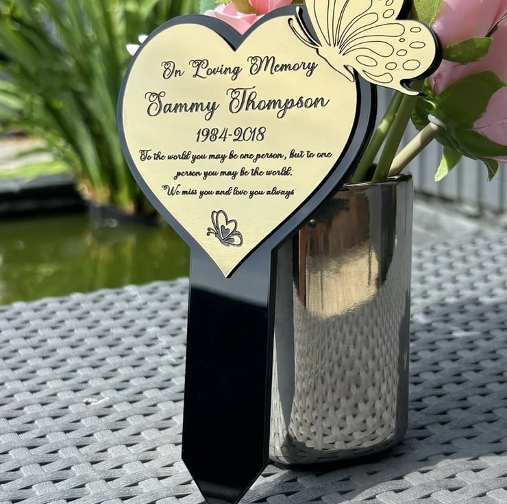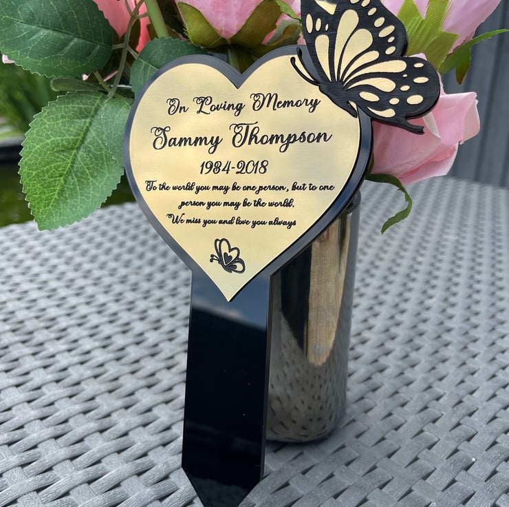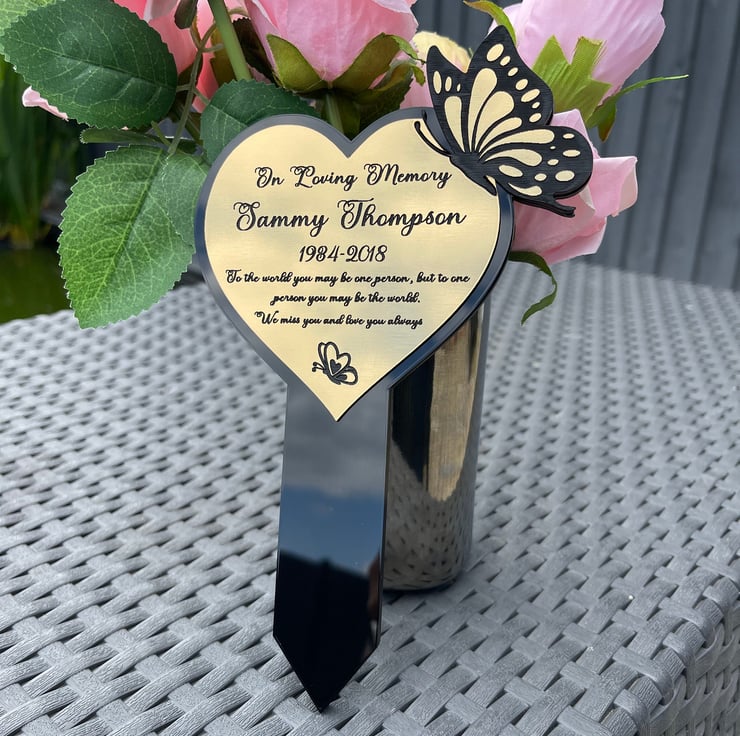 Handmade personalised memorial grave marker stakeplaque created from durable black gloss acrylic and finished with metallic Gold or Silver brushed steel effect engraved acrylic.
