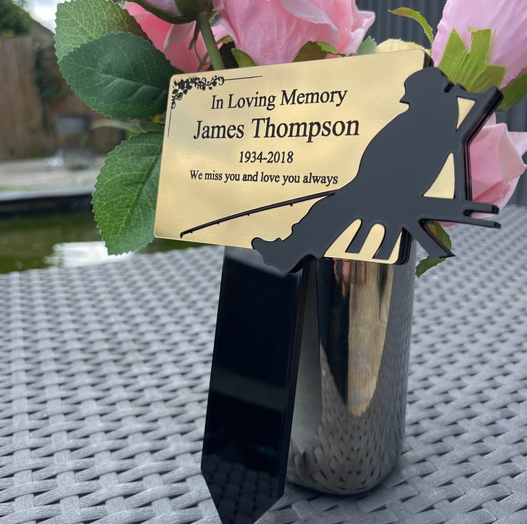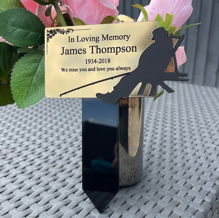 Handmade personalised memorial grave marker stakeplaque created from durable black gloss acrylic and finished with metallic Gold or Silver brushed steel effect engraved acrylic.