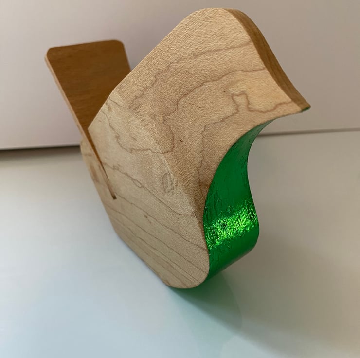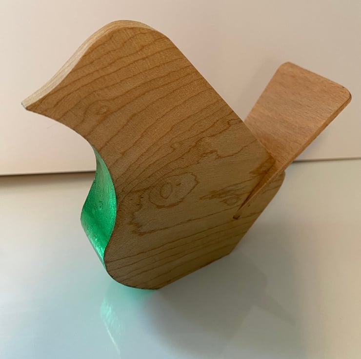 The wood is light in colour with a beautiful grain showing. The chest is an amazing metallic green that catches the light & shines. The tail is cut from a separate piece & slotted in place.