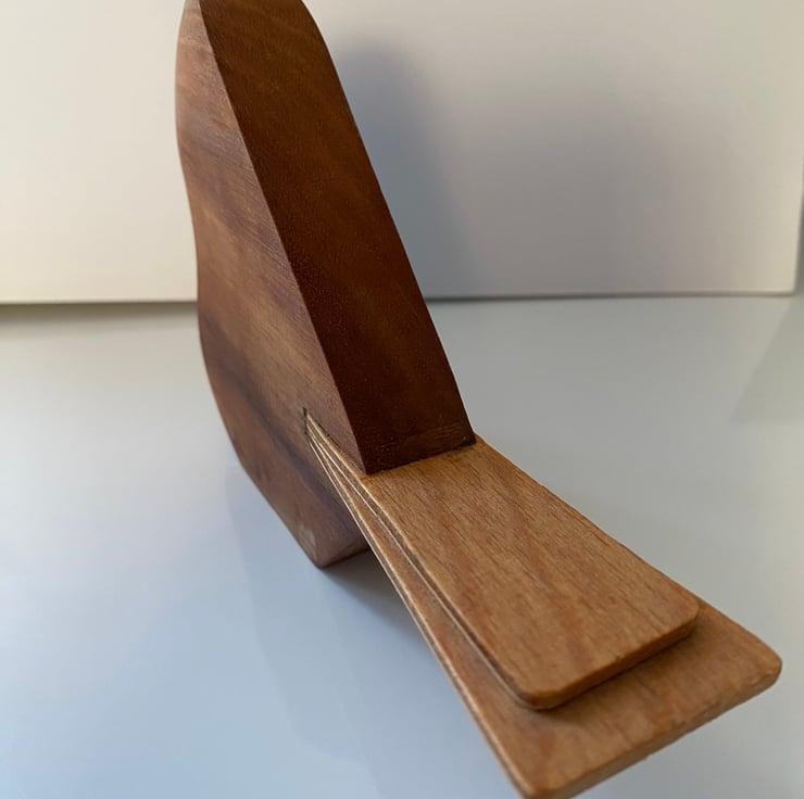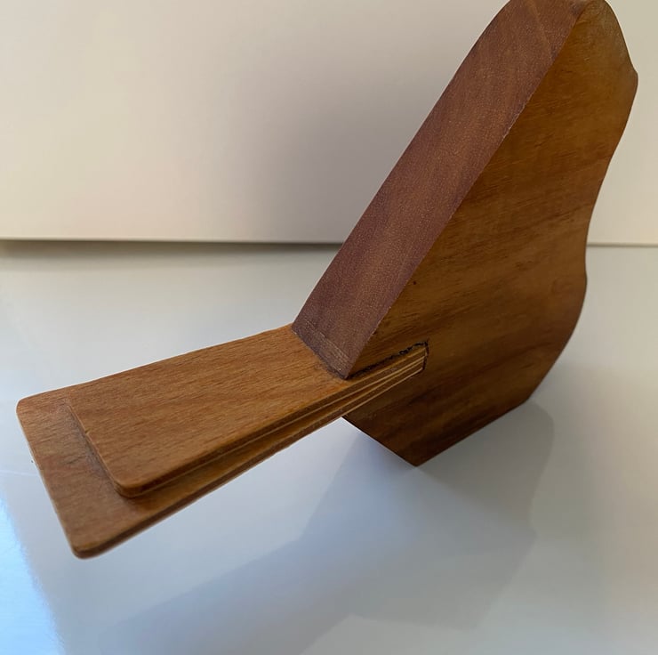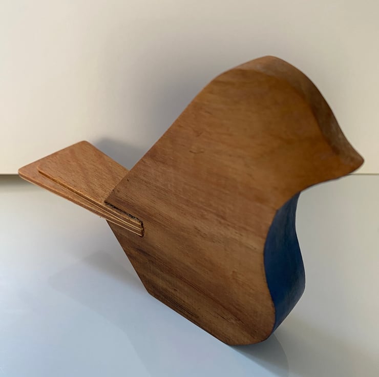 It is in a warm medium brown wood with a subtle darker stripe running through. It’s chest is painted in a dark blue that has a sheen to it that catches the light. The tail is made from two separate pieces slotted into the body.