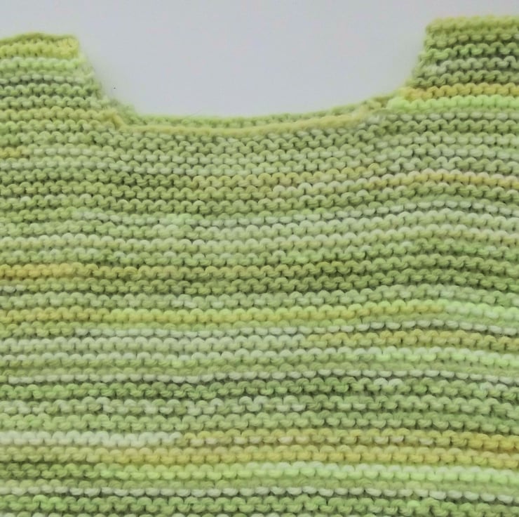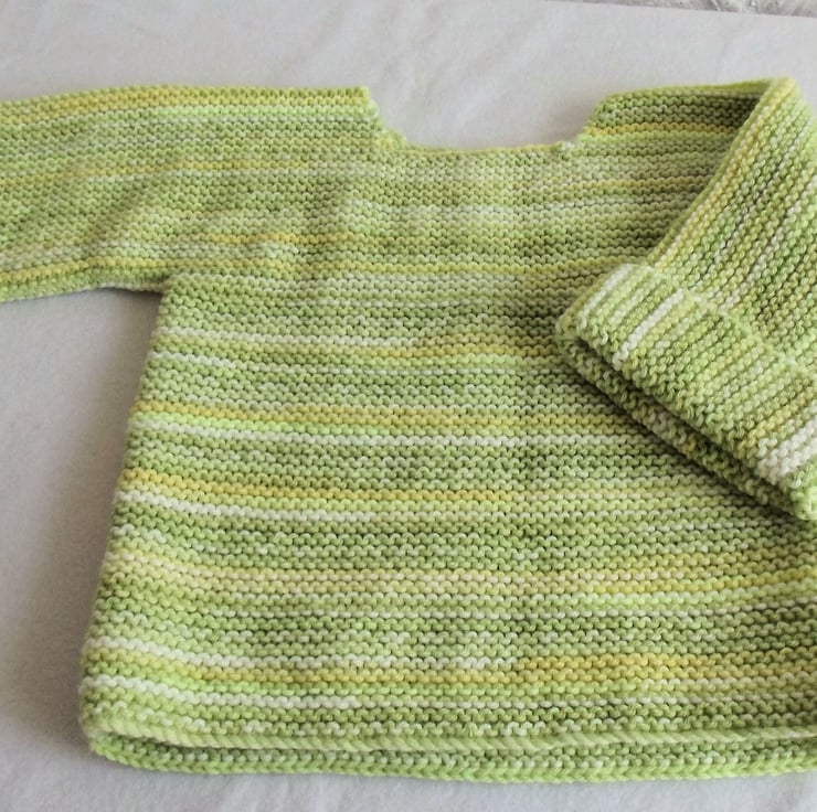 Hand knitted by me. Green Shades Babies Sweater Jumper. Round Neck neck with turnback cuffs. Knitted in medium weight acrylic blend yarn. hm115