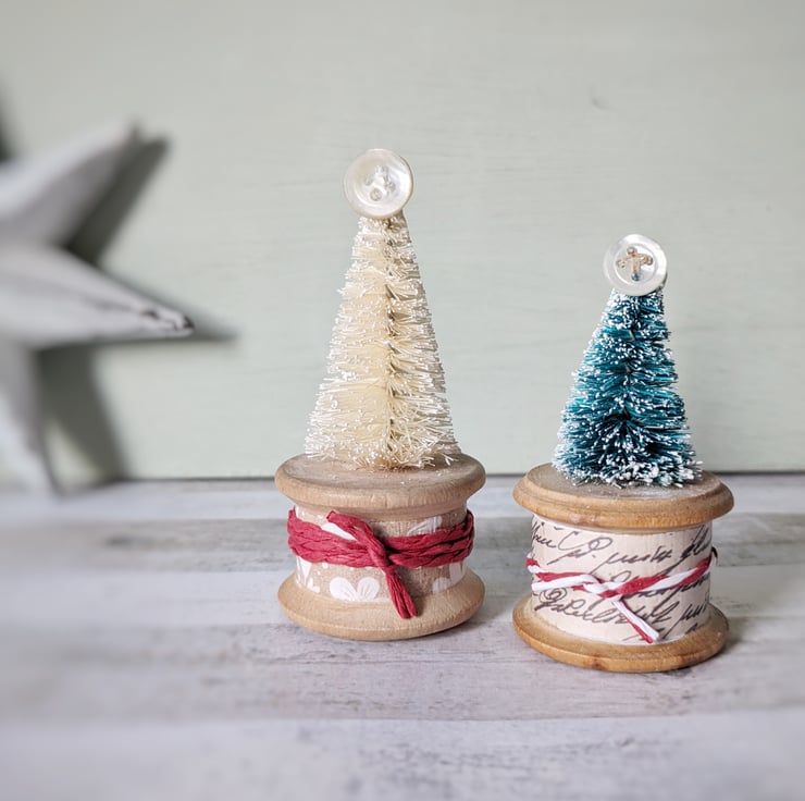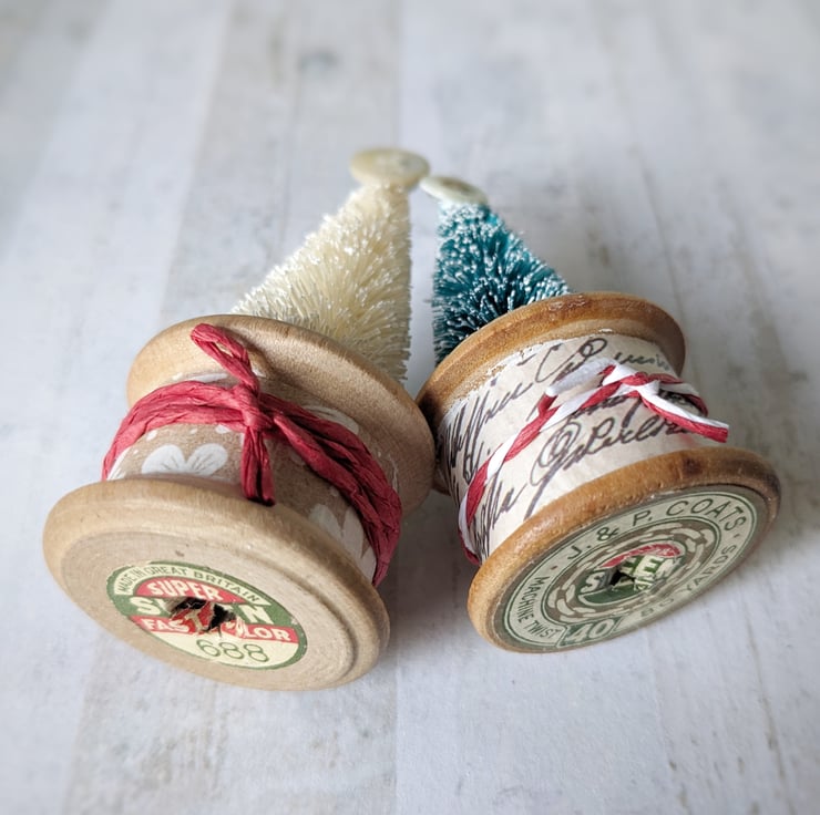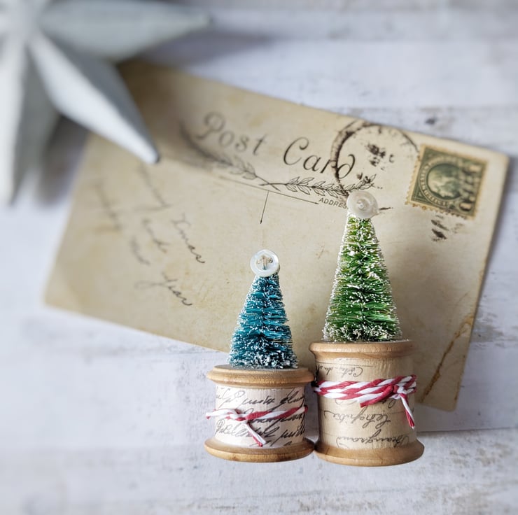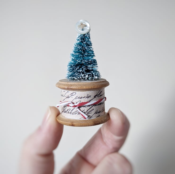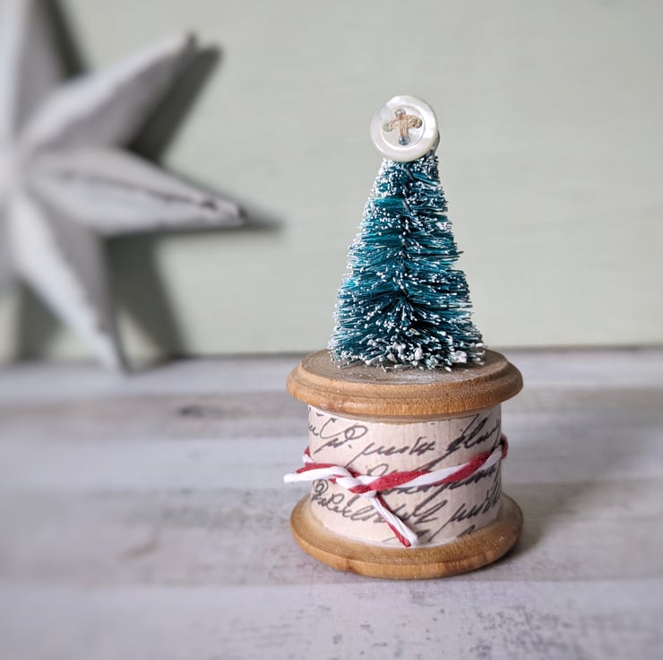 A little Festive tree sits atop a worn vintage wooden bobbin with a teeny mother of pearl button for a star!