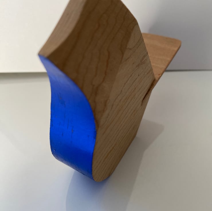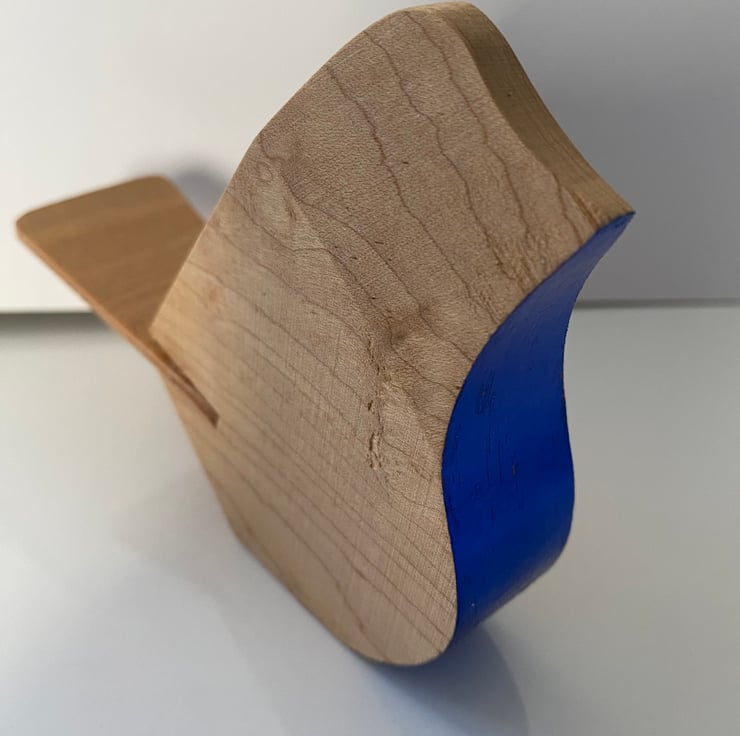 The timber is light in colour with a lovely grain running through. The chest is painted in a metallic blue which catches the light & shines. The tail is a separate piece slotted into the body.
