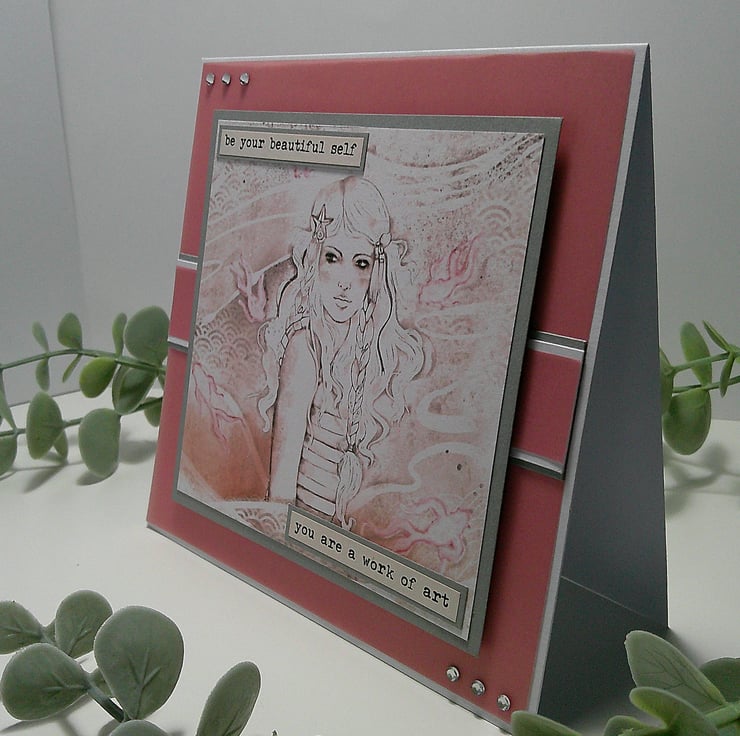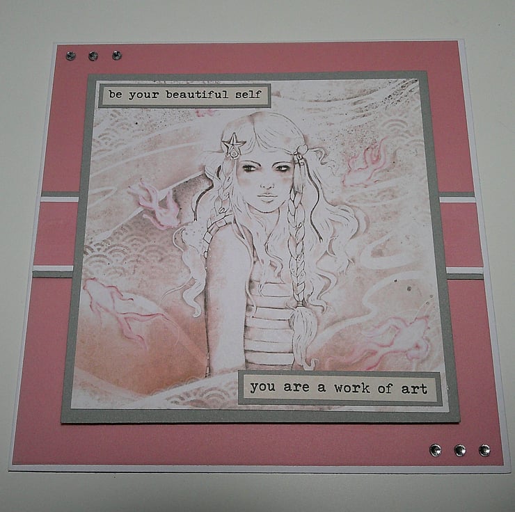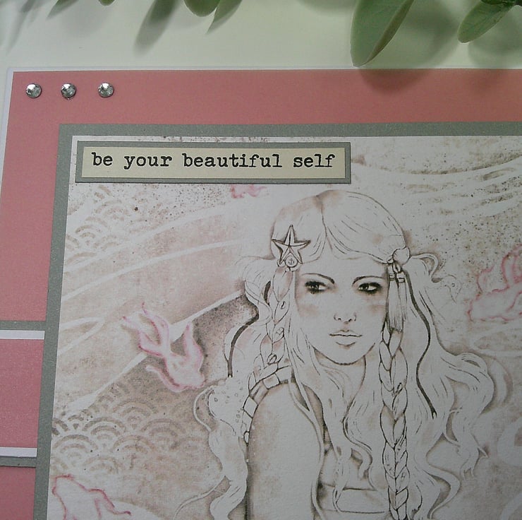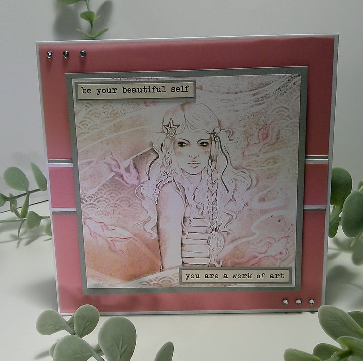 5 x 5 inch (13 x 13 cm) card featuring vellum, diamante embellishments, and 2x sentiments reading 'be your beautiful self' and 'you are a work of art'.